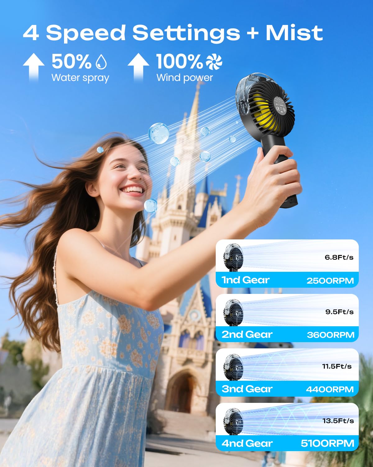 - đă4-Speed Cooling with Mist FunctionăOtlonpe mister fan offers gentle to strong airflow, plus a misting mode that provides enhanced cooling compared to regular handheld fans. The water-enhanced airflow provides water-cooled comfort - perfect for staying comfortable in various temperatures throughout your day