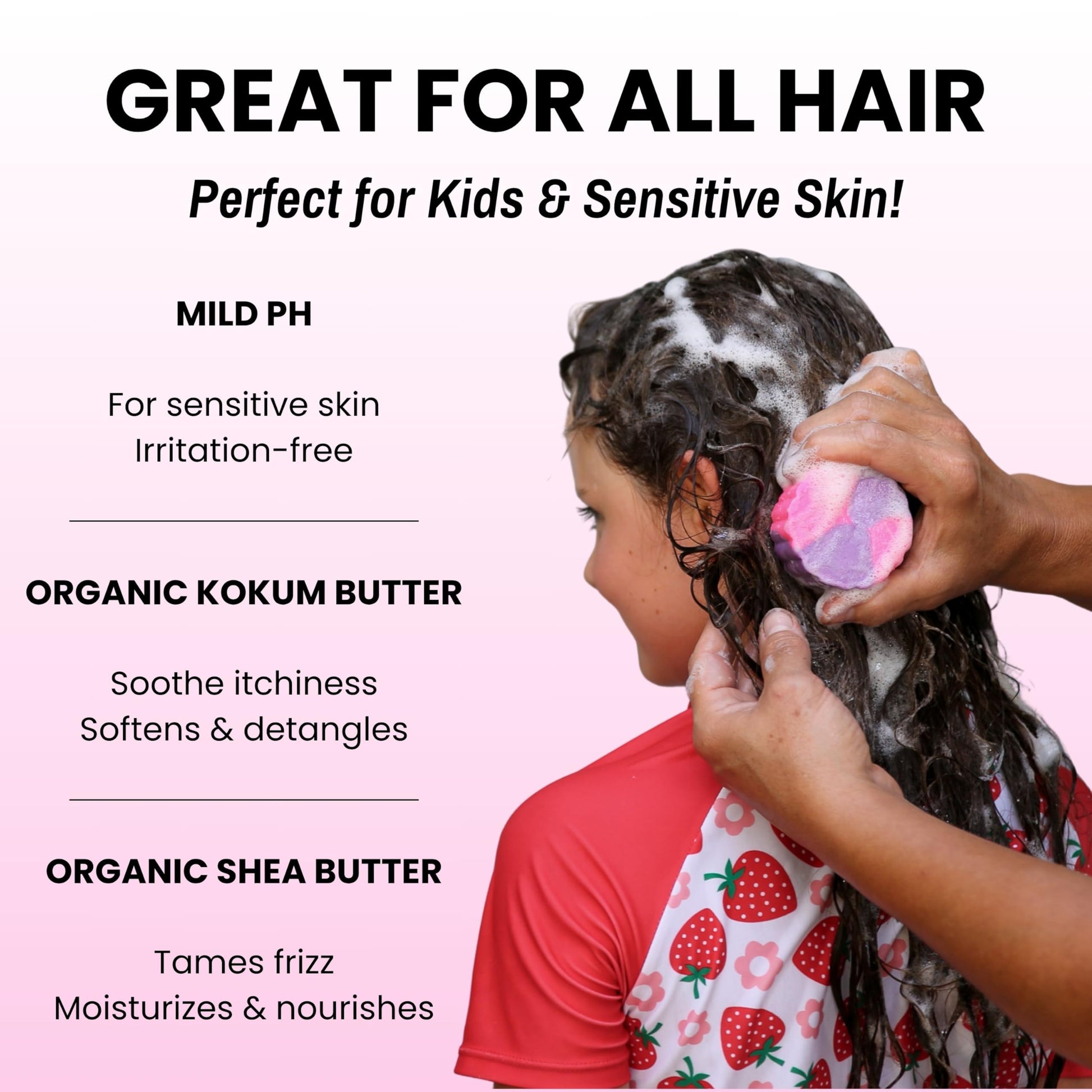 - MADE WITH ORGANIC & PLANT-BASED INGREDIENTS - Organic shea, baby foam, and kokum butter for a creamy, mild lather that nourishes, soothes, and hydrates growing hair.
