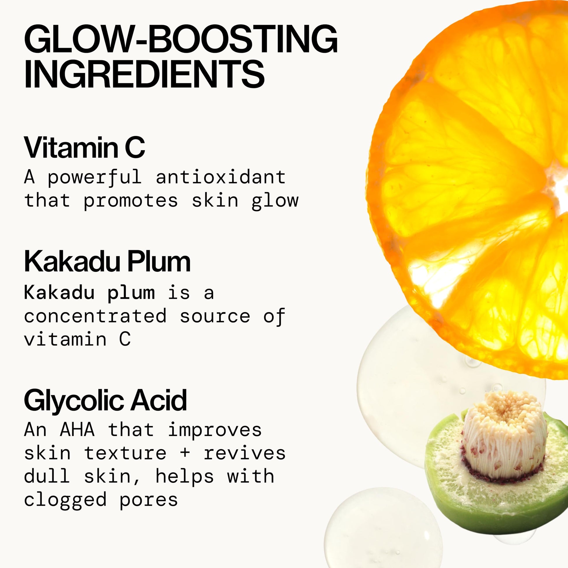 - VITAMIN C & GLYCOLIC ACID: Our combination of ingredients includes vitamin C – a beloved antioxidant & brightener support for skin, and glycolic acid – an AHA that has been shown to help improve texture, brighten, and refresh lackluster skin.