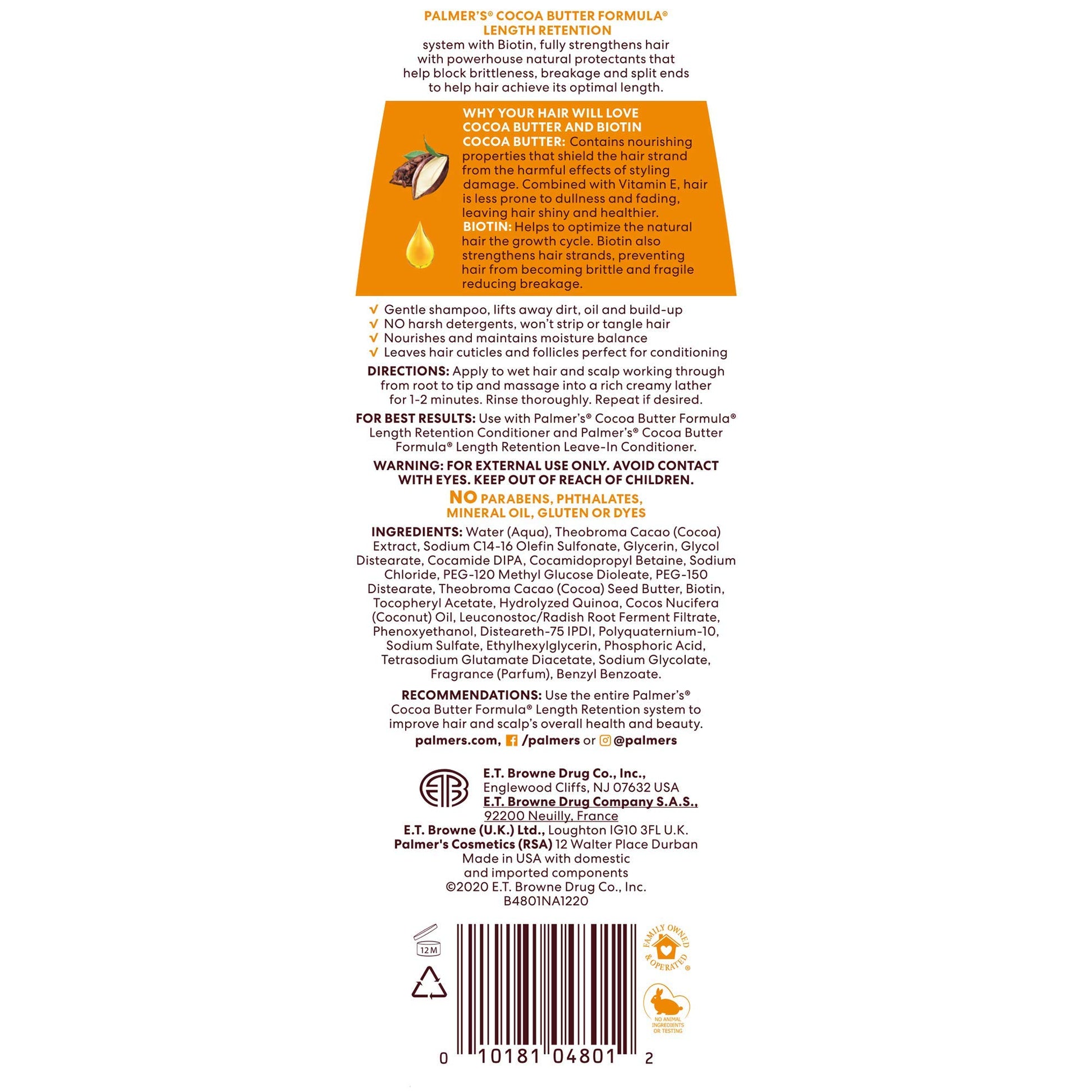 Details: Palmer’s Cocoa Butter Formula Length Retention system with Biotin, fully strengthens hair with powerhouse natural protectants that help block fragileness, brittleness, breakage and split ends, to help hair achieve its optimal length. This creamy, silicone free, non stripping , color safe shampoo, gently lifts away oil, dirt and build up with strengthening protectants, while leaving strands perfectly prepared for conditioning.