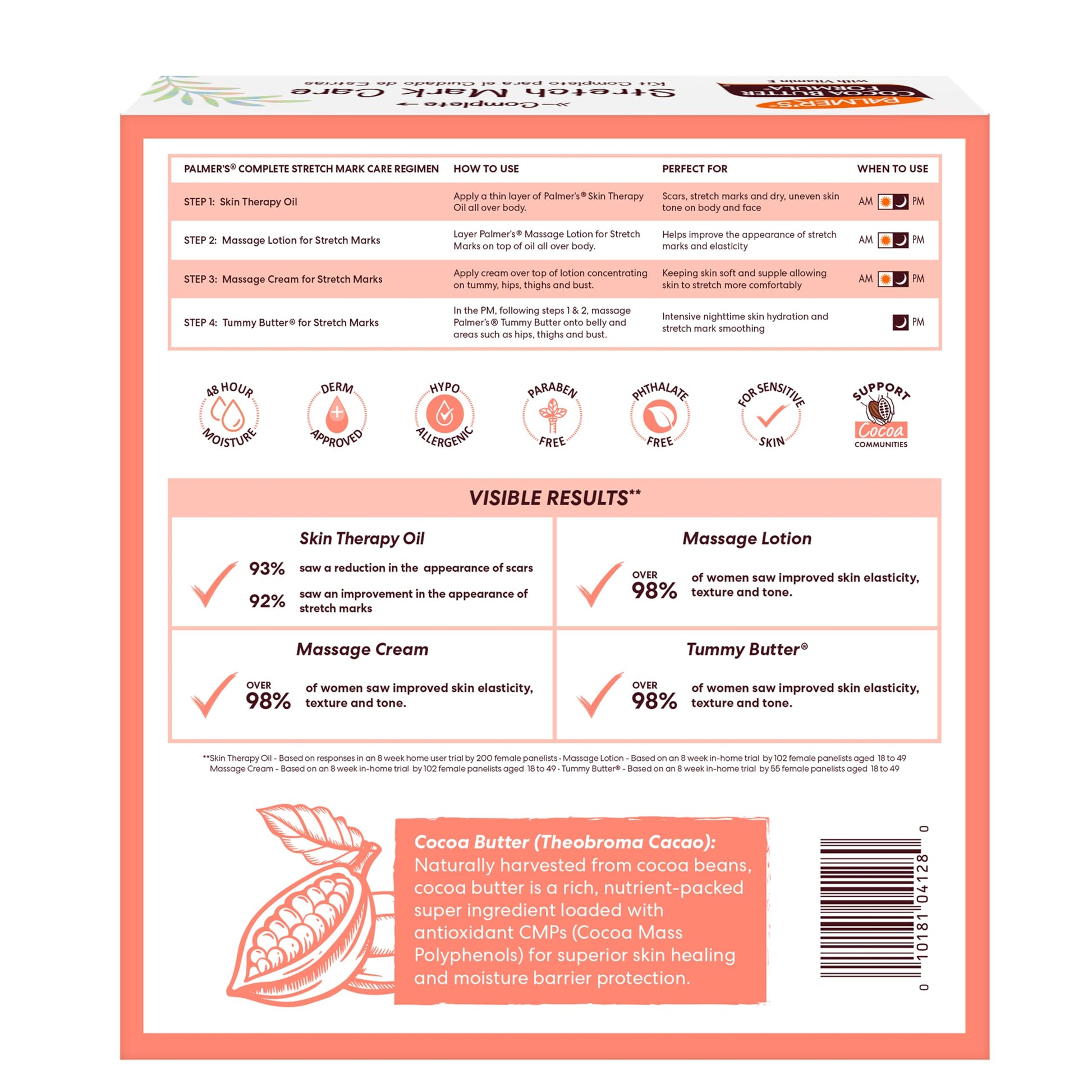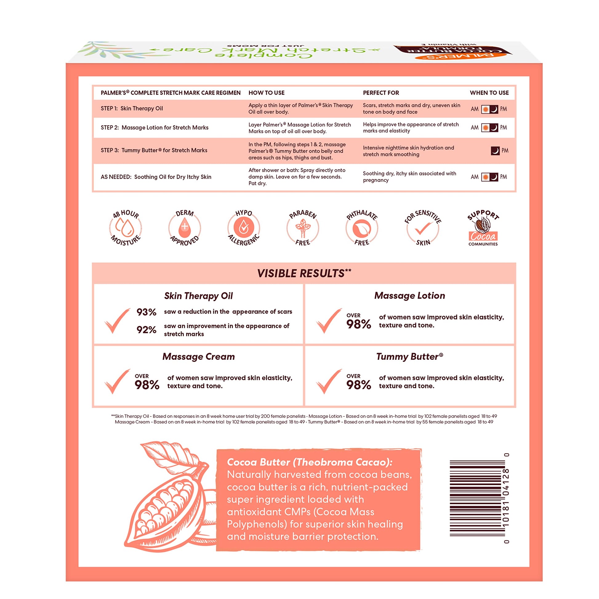 Details: The statistics are remarkable—nine out of ten pregnant women develop stretch marks at some point in their pregnancy. Some women notice them as early as their first trimester, while others don't notice them until the end of their pregnancy. And stretch marks are not just limited to the belly where the baby is growing; thighs, hips, breasts, and buttocks can all show signs of stretching. The cause? The collagen and elastin fibers that keep your skin firm and tight stretch and tear due to pregnancy hormones and the pressure on your body from rapid weight gain. As an expectant mom, it's important to take care of your own health and well-being in order to give your baby the best start in life. A prenatal pregnancy regimen can help you do just that. So, along with your pregnancy pillow, prenatal vitamins, and fetal doppler, be sure to include Palmer’s Stretch Mark Care Collection to ensure your body and your skin are well taken care of throughout your pregnancy. While you can't prevent stretch marks, you can help reduce their appearance with the support from Palmer's Cocoa Butter Formula's maternity skincare collection. Applying a stretch mark cream or pregnancy lotion is a popular way to treat stretchmarks. The Palmer's Complete Stretch Mark Care kit is designed specifically for pre-natal skincare, as it includes a stretch mark cream, a stretch mark lotion, a stretch mark tummy butter, and a skin therapy body oil for stretchmarks and scars. A regular on the list of pregnancy must haves, this baby registry gift for a new mom (or for yourself!), is safe to use while pregnant and helps reduce stretch marks as you and your baby grow. Proudly made in U.S.A.