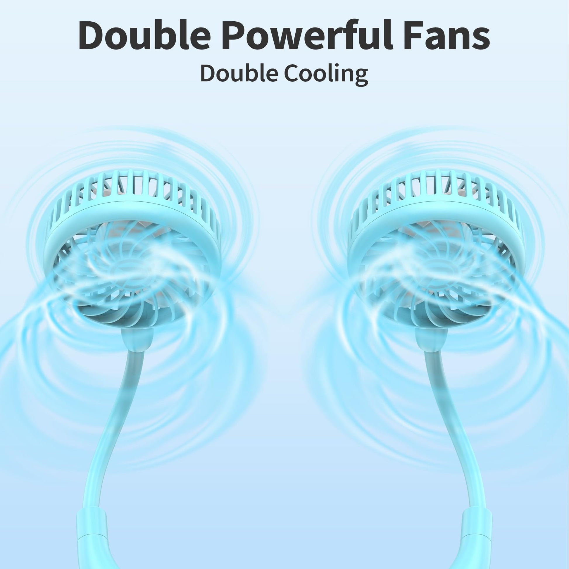 - 2 Fans with Adjustable Angles: this personal fan has 2 separate fans heads, generating more powerful airflow than those blade-less fan, meanwhile you can direct the wind at will to cool your neck and face due to the flexible band