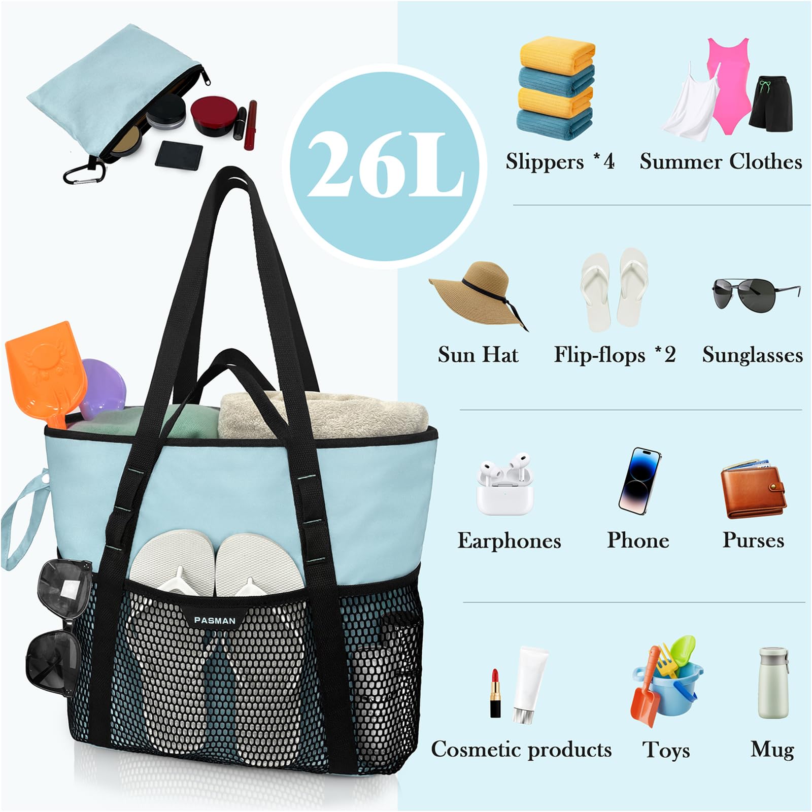 PASMAN Beach Bag with Zipper - 8 Pockets Sandproof Beach Tote Bag for Women,Foldable Lightweight Family Swim Bag Vacation (Light Blue)
