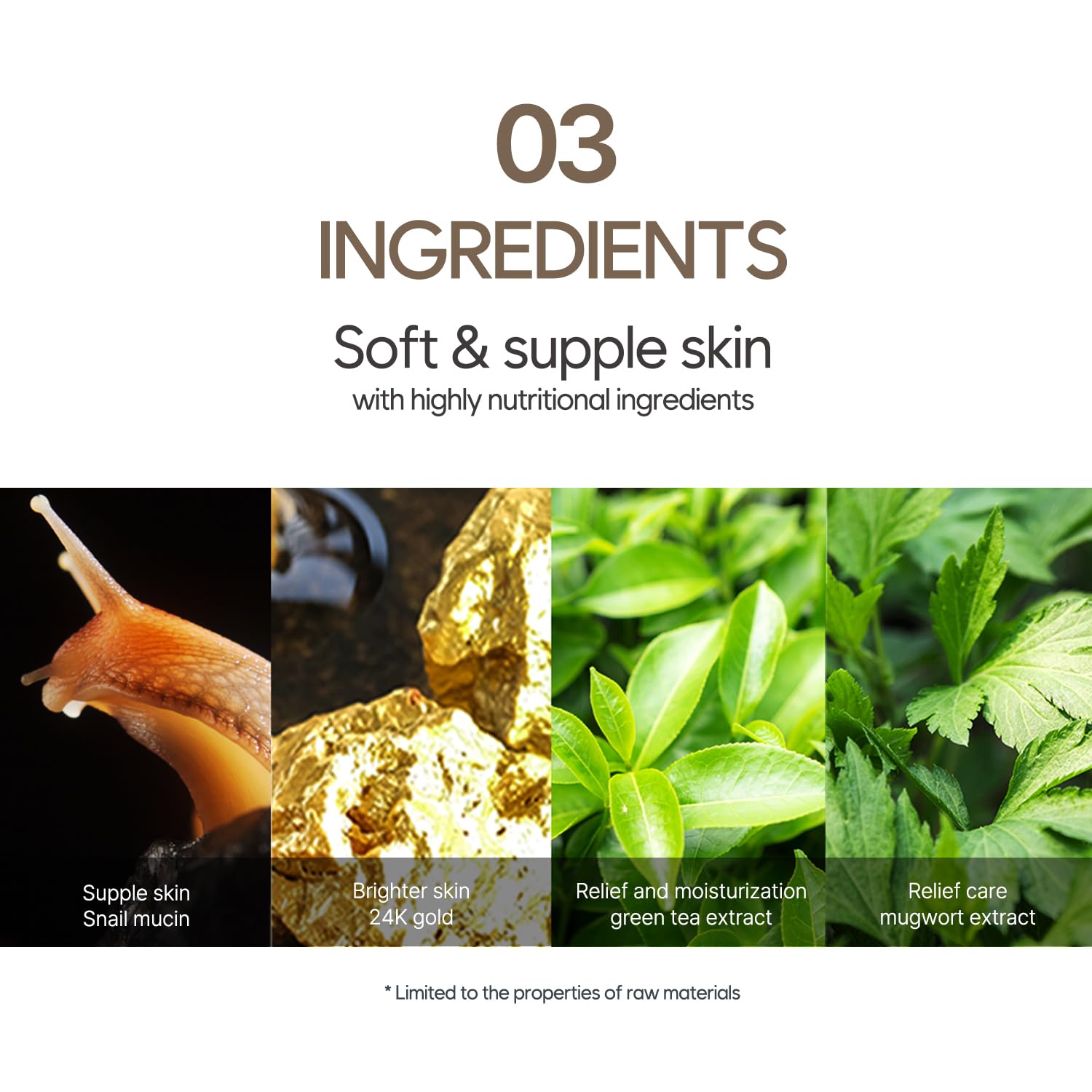 Details: Gold and snail slime extract help to make your skin firm and healthy.