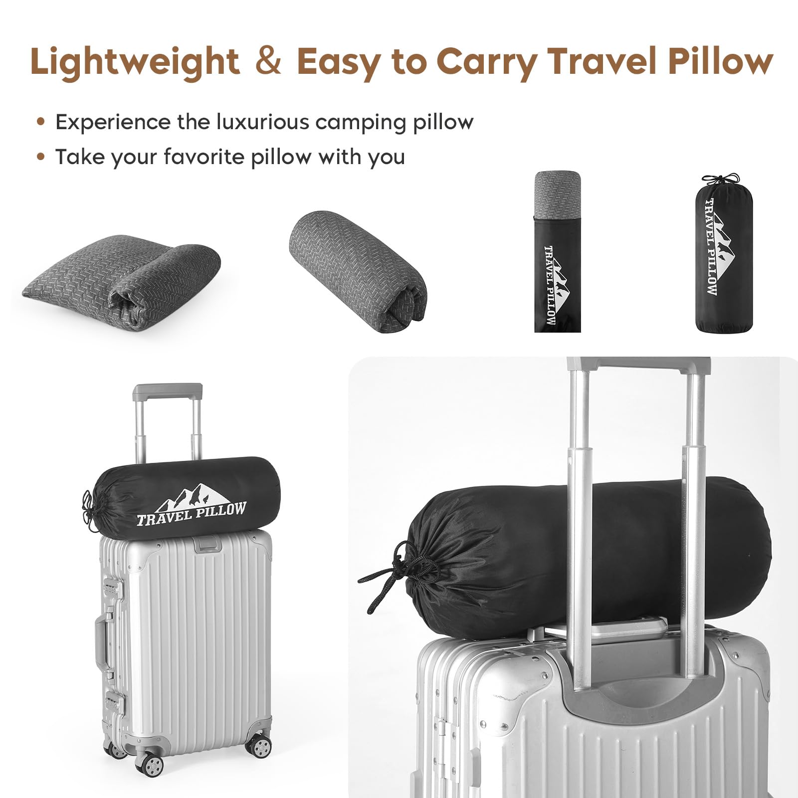 - 【Compact and Portable】PEUJEW camping pillow measures 12* 16 inches in size (Hand-measured product, ±1-2 inch error), featuring a compressible and portable design with a practical travel bag. It easily attaches to luggage or hangs in the car, making it ideal for business travelers, campers, and backpackers