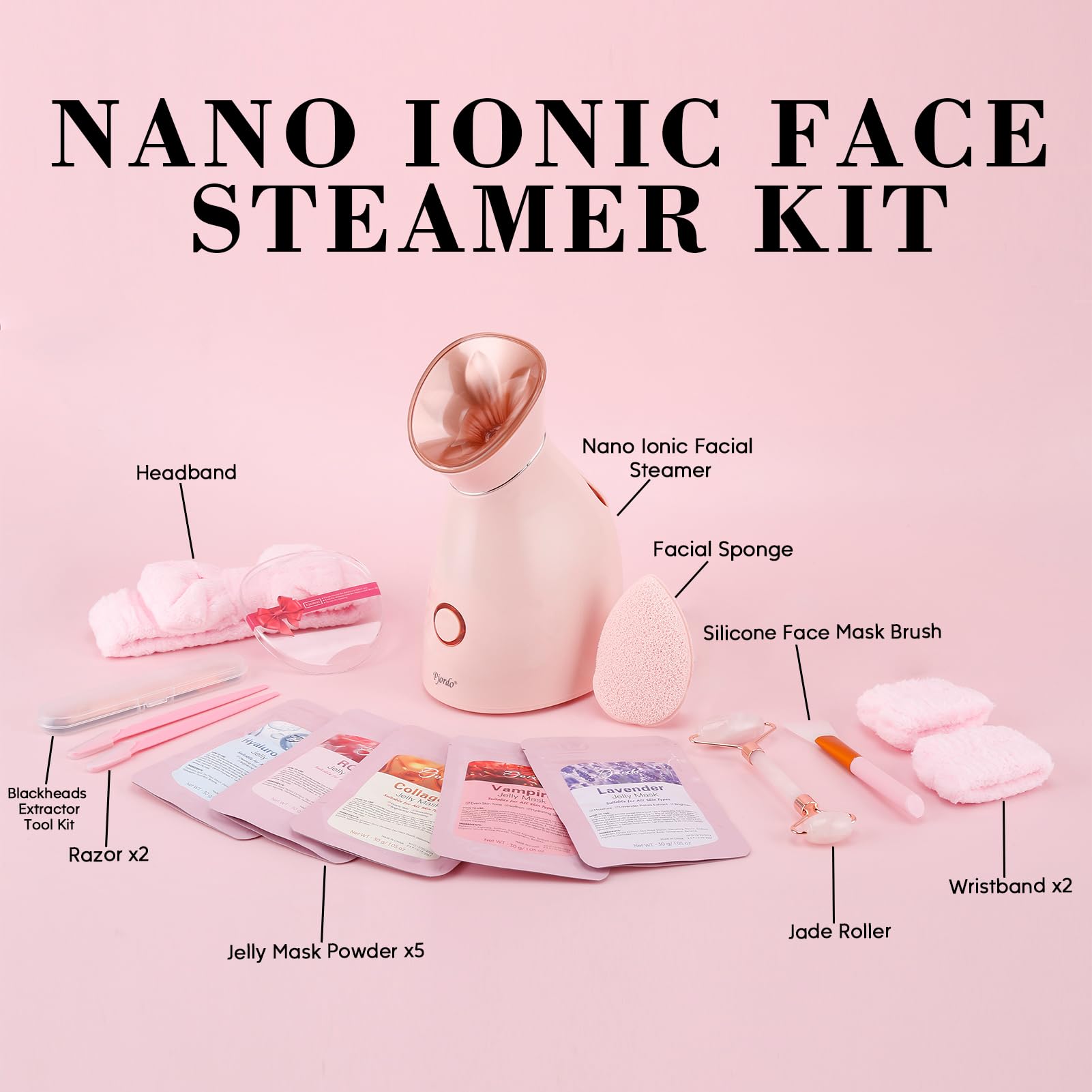 Pjordo Facial Steamer Spa Kit, 12 Skin Care Tools & 5 Jelly Mask Powder, Nano Ionic Steamer for Facial Deep Cleaning Unclog Pores Sinuses, Warm Mist Humidifier for Home SPA, Self Care Gifts for Women