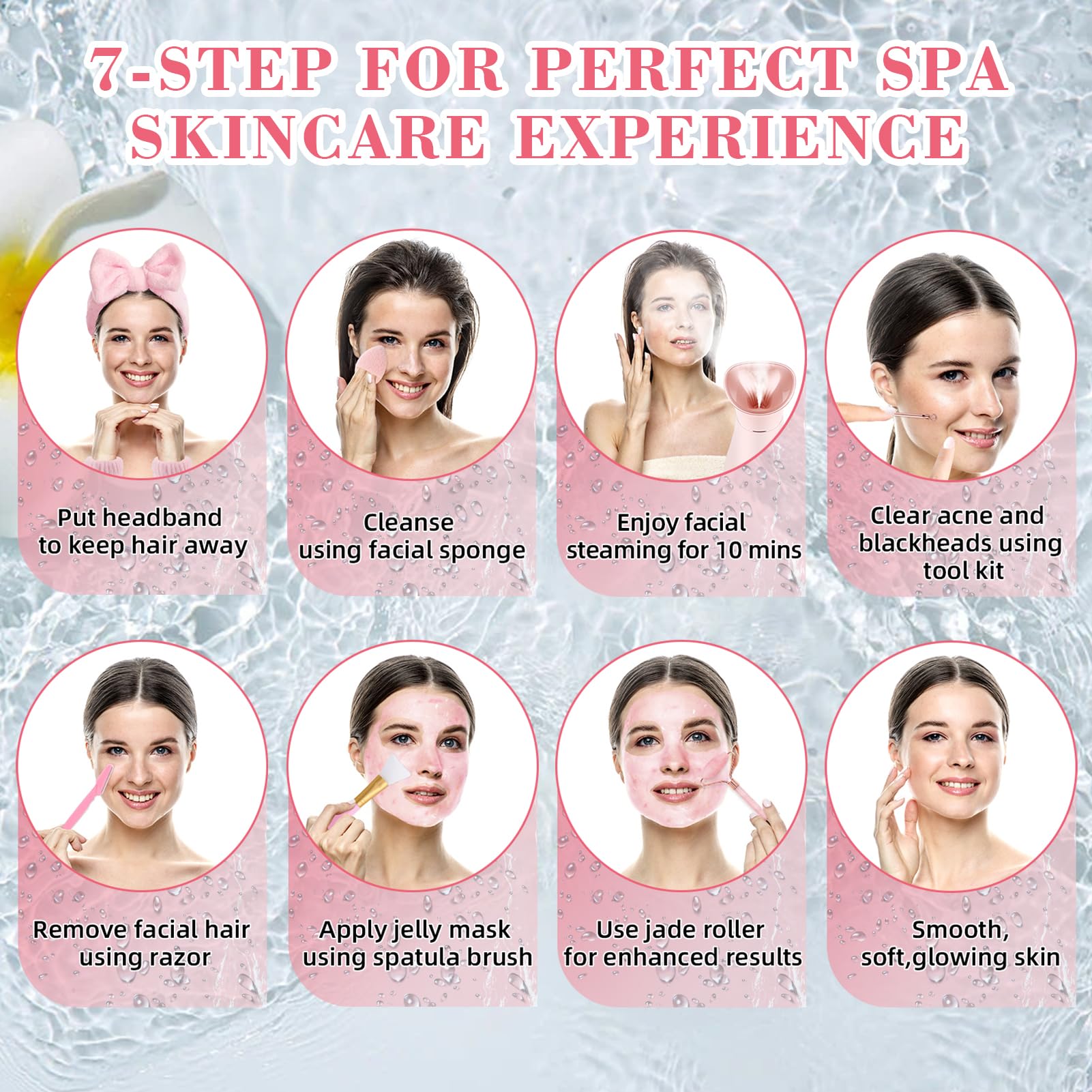 - Professional 7 Skin Care Tools Included: Headband, handband, extraction tool kit to remove blackheads, razor to remove excess face hair, silicone brush to apply jelly mask, jade roller for massaging and sponge puff for cleansing. 7 Skin care tools use with the facial steamer to nourish and cleanse your skin. Giving you a complete spa experience.