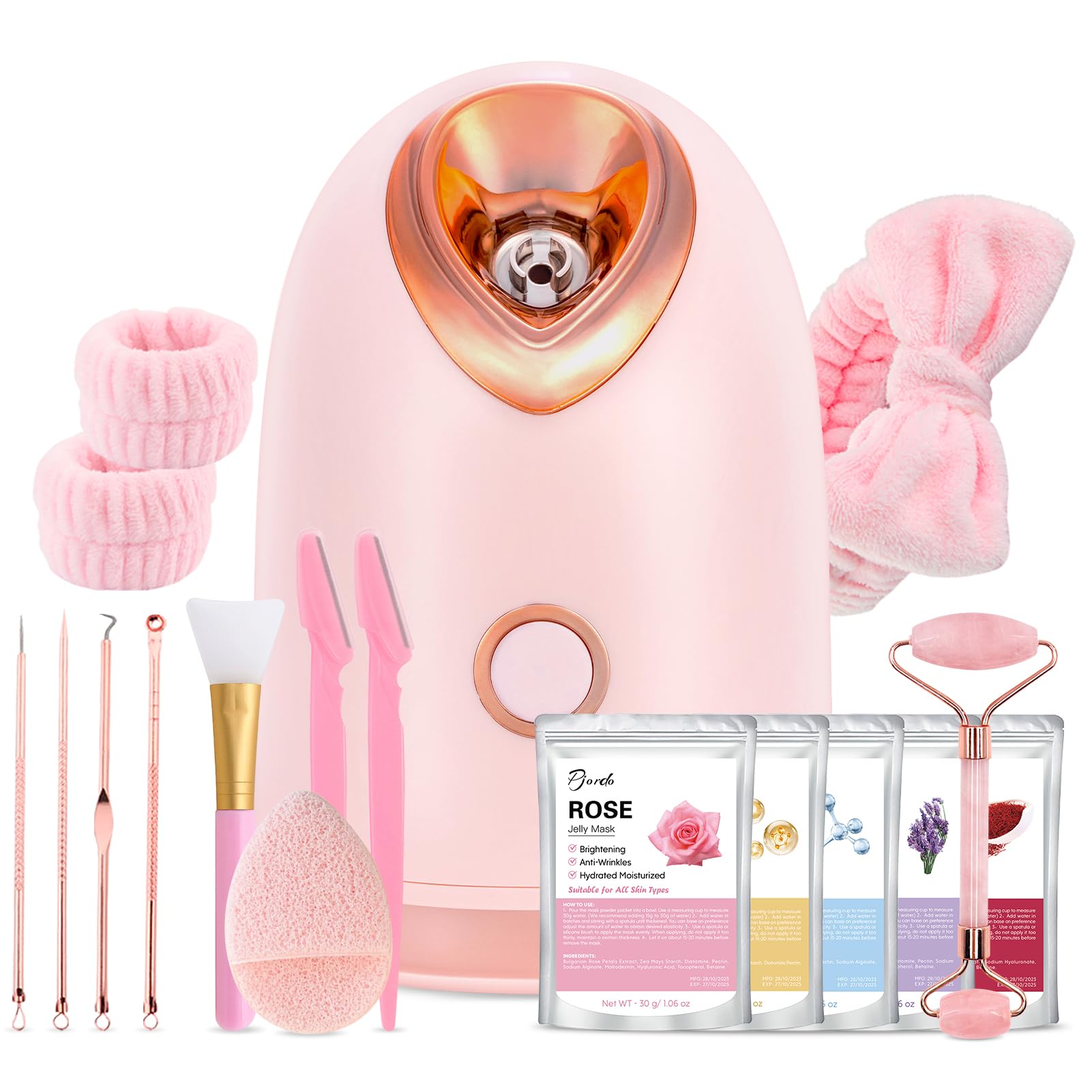 - Professional 7 Skin Care Tools Included: Headband, handband, extraction tool kit to remove blackheads, razor to remove excess face hair, silicone brush to apply jelly mask, jade roller for massaging and sponge puff for cleansing. 7 Skin care tools use with the facial steamer to nourish and cleanse your skin. Giving you a complete spa experience.
