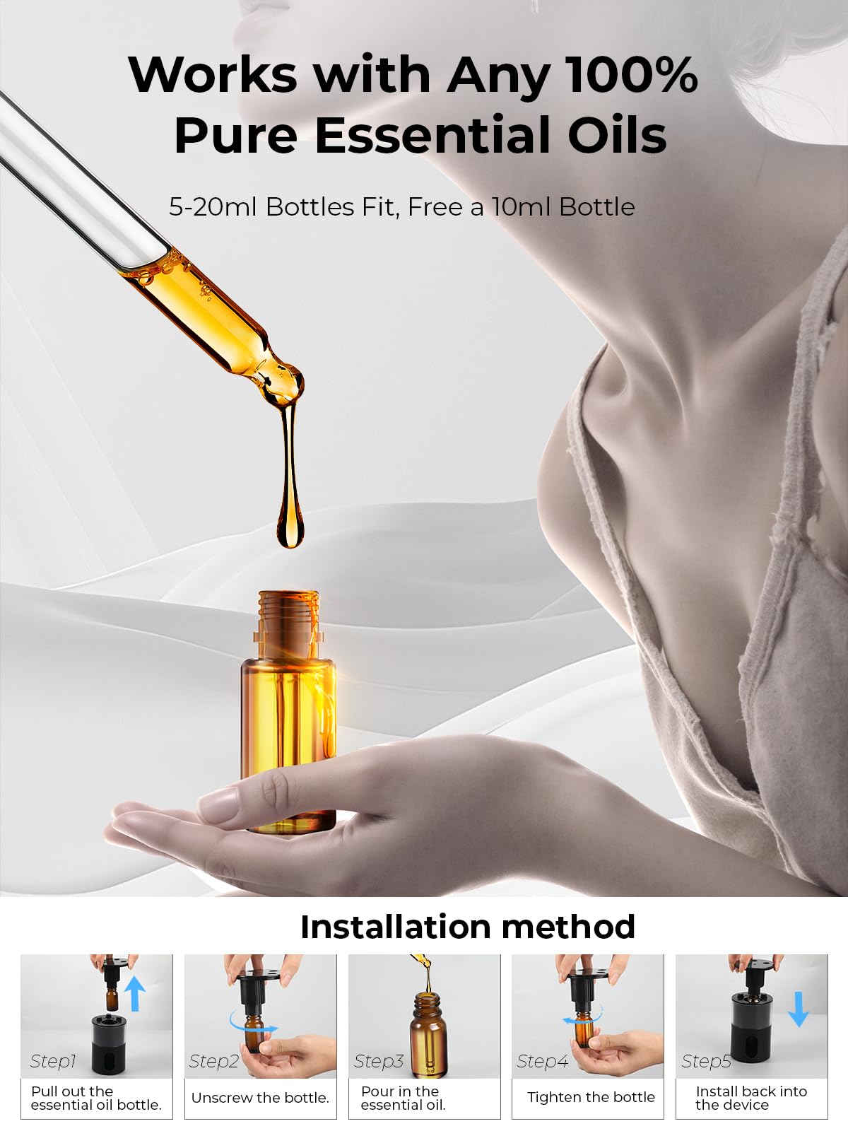 - Universal Bottle Compatibility: The diffuser fits standard 5mL,10mL,15mL and 20mL US essential oil bottles. Just screw your bottle right on nozzle, or pour oil into the included bottle,Enjoy effortless, tool-free installation