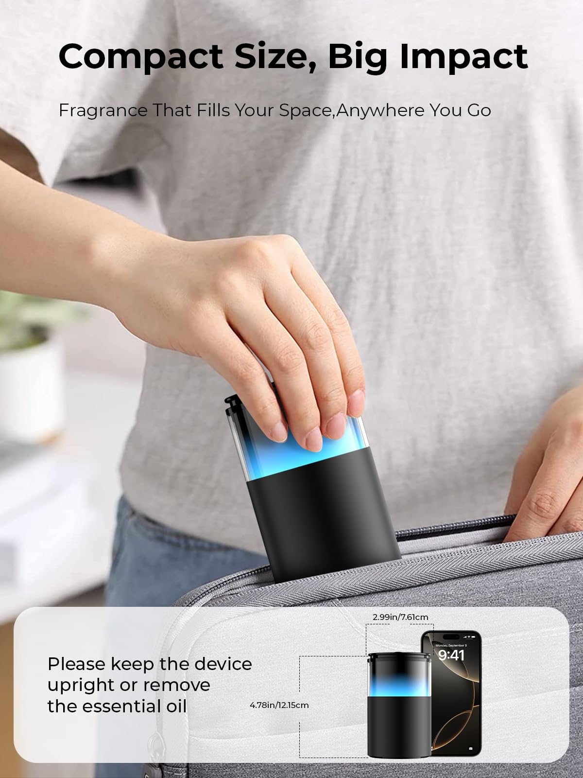- Portable Scent Diffuser for Home&Car&Office: This compact aromatherapy diffuser easy maintenance,fits in most car cup holders, and allows you to enjoy fresh fragrance anytime, anywhere. The 2000mAh battery life up to 48 hours with USB-C fast charging (3hrs). This cordless aromatherapy diffuser is ideal for car, home,office and travel.