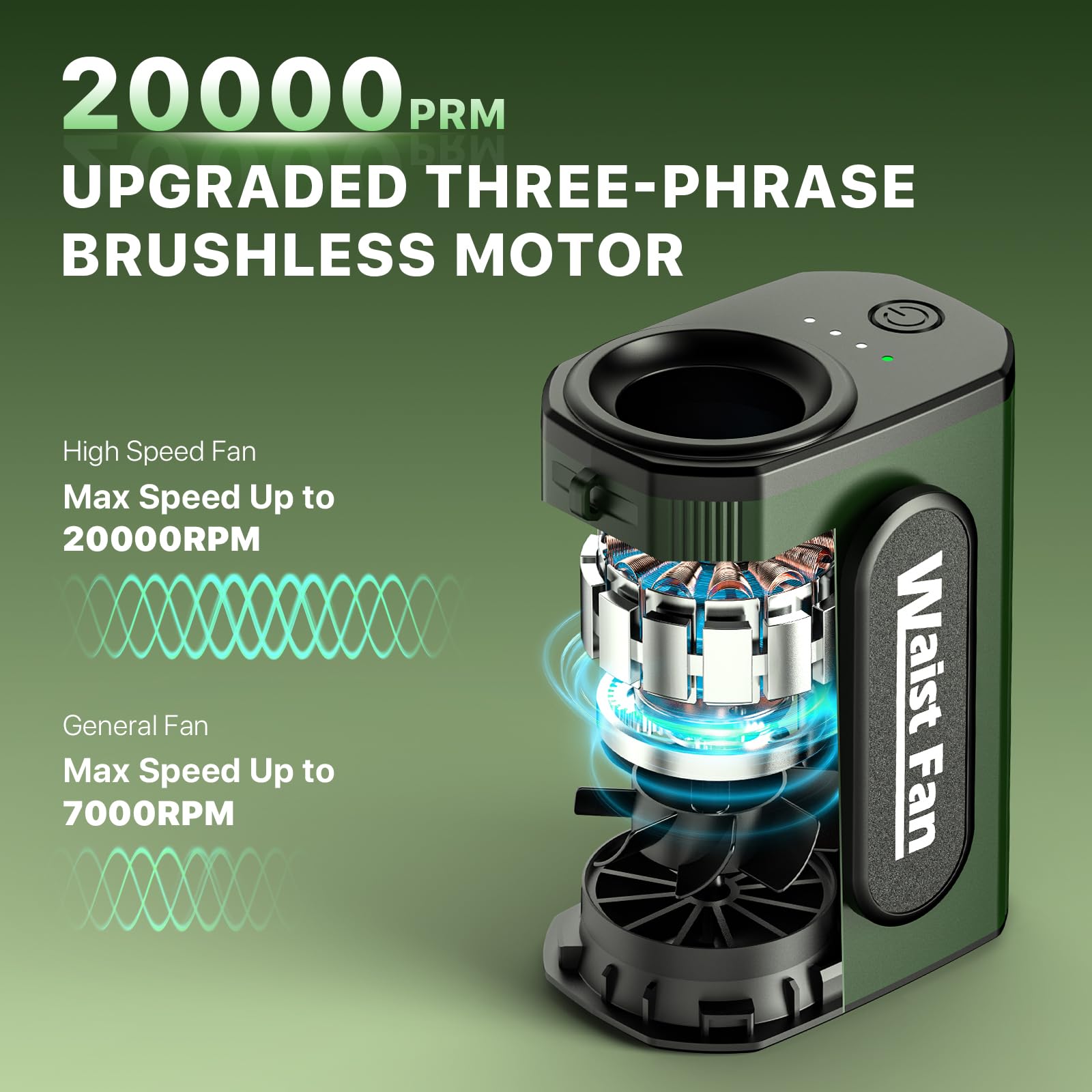 - 【4-Speed&20000RPM Powerful Turbine Airflow】This waist fan featuring a newly upgraded high-speed brushless motor and a 7-blade turbo fan that spins up to 20000 RPM and provides airflow speeds up to 38 ft/s. With 4-speed adjustable airflow, ranging from a gentle breeze to an invigorating blast. This powerful airflow will whisk away your body heat in a matter of seconds, keeping you comfortable anytime, anywhere.