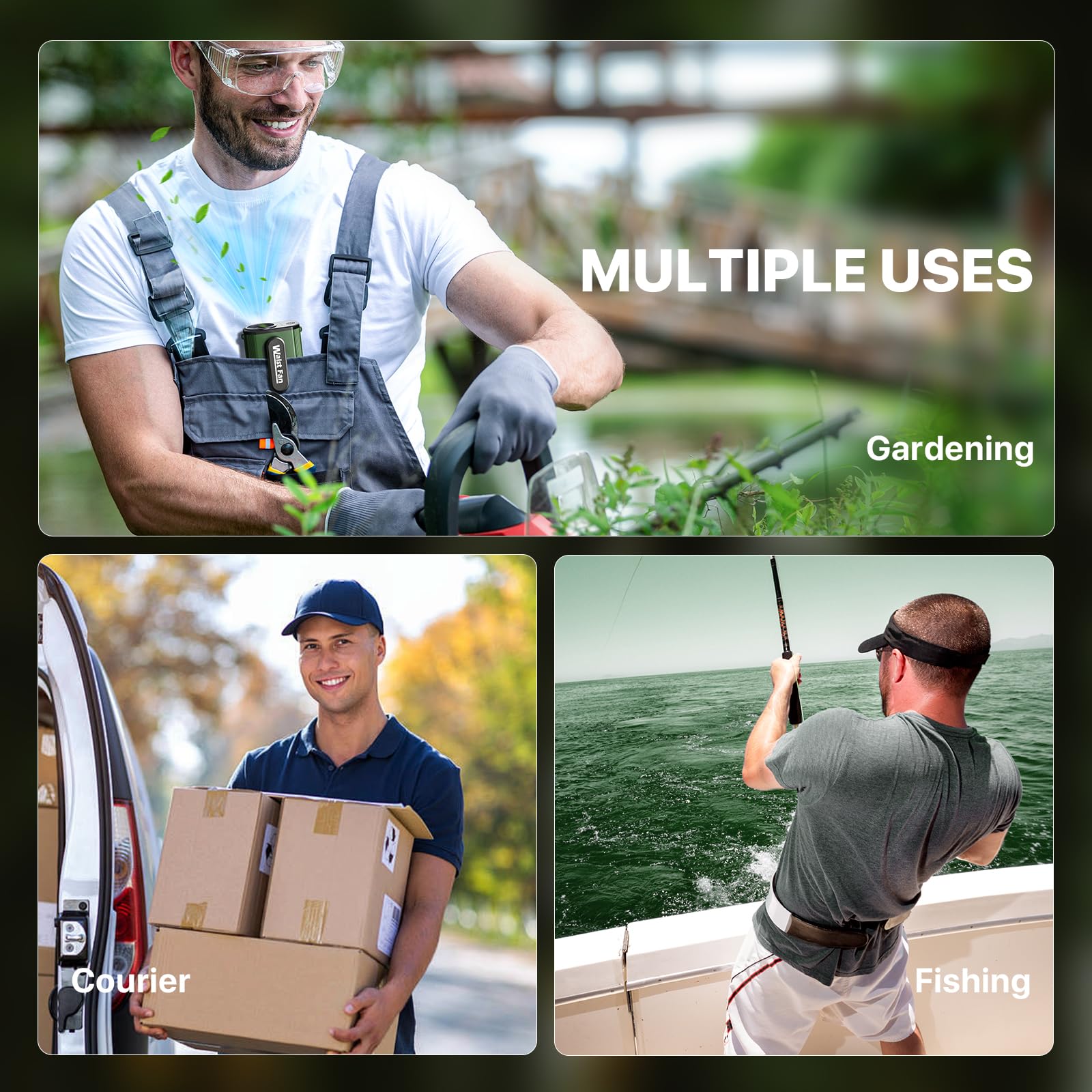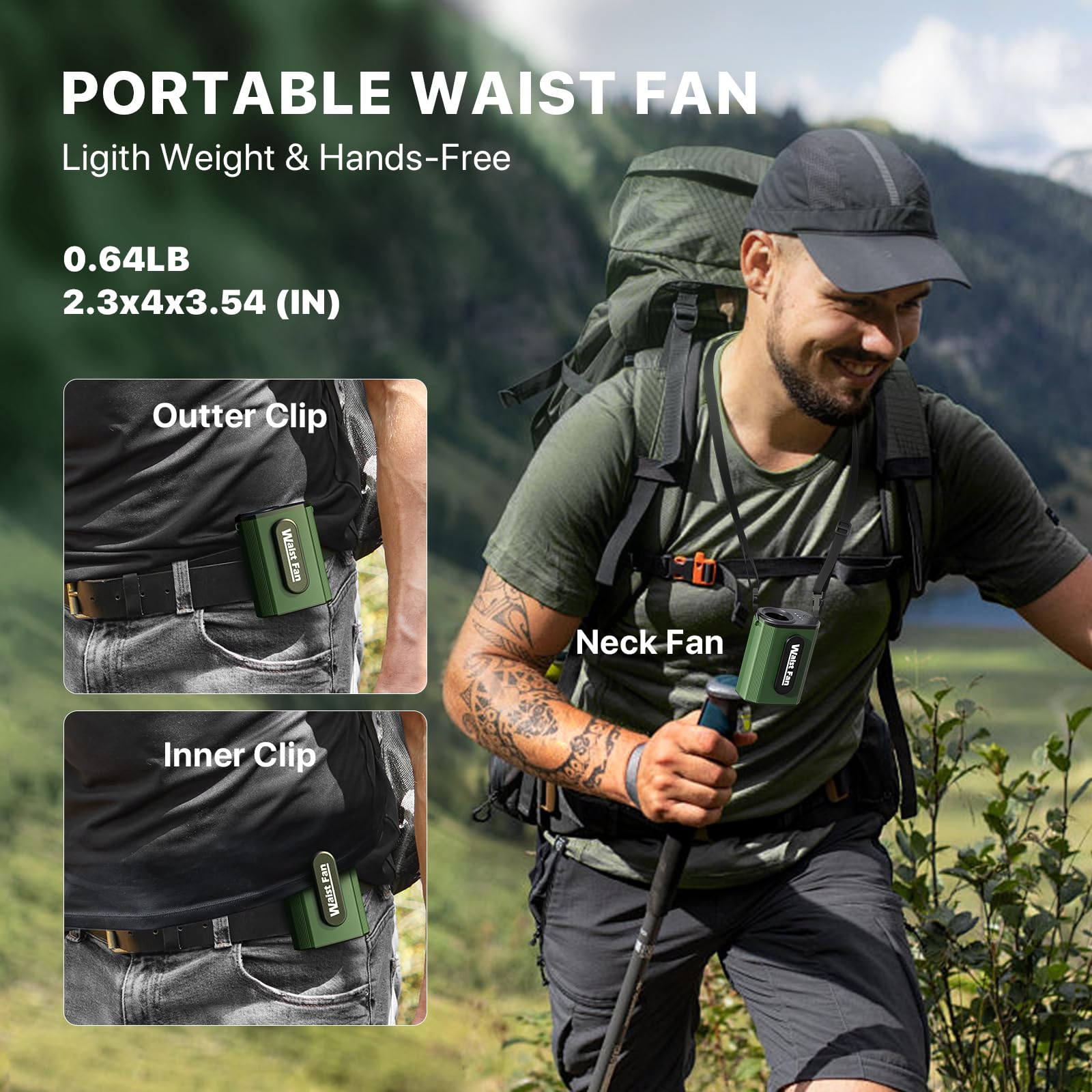- .【Hands-Free 3-in-1 Cooling Solution】This personal fan can be used as a waist fan, neck fan(hang it around your neck with the included lanyard), handheld fan. With this portable waist fan, you're essentially getting 3 amazing personal cooling devices. Designed specifically for hot environments, this wearable fan has you covered for all your indoor and outdoor cooling needs this summer.