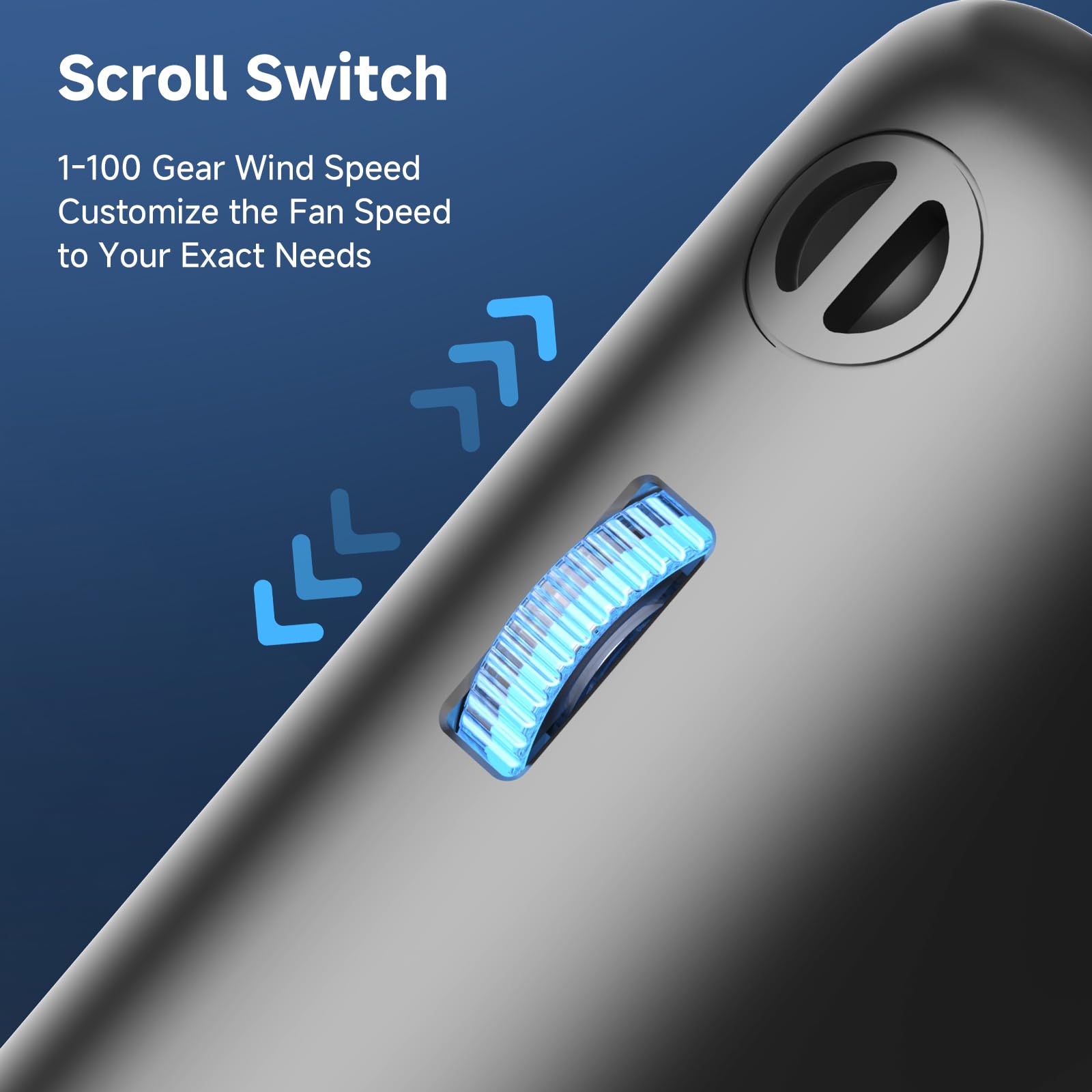 - 【LED Digital Display & 100-Level Wind Speed Precision】This portable fan revolutionizes cooling with its innovative scroll wheel, enabling seamless adjustment from Level 1 to 100 for ultra-precise airflow customization, from a gentle whisper of a breeze perfect for quiet reading to a powerful gust ideal for intense workouts. The integrated LED digital screen clearly shows the current wind level, battery percentage, and operating mode in real-time, ensuring effortless control anytime