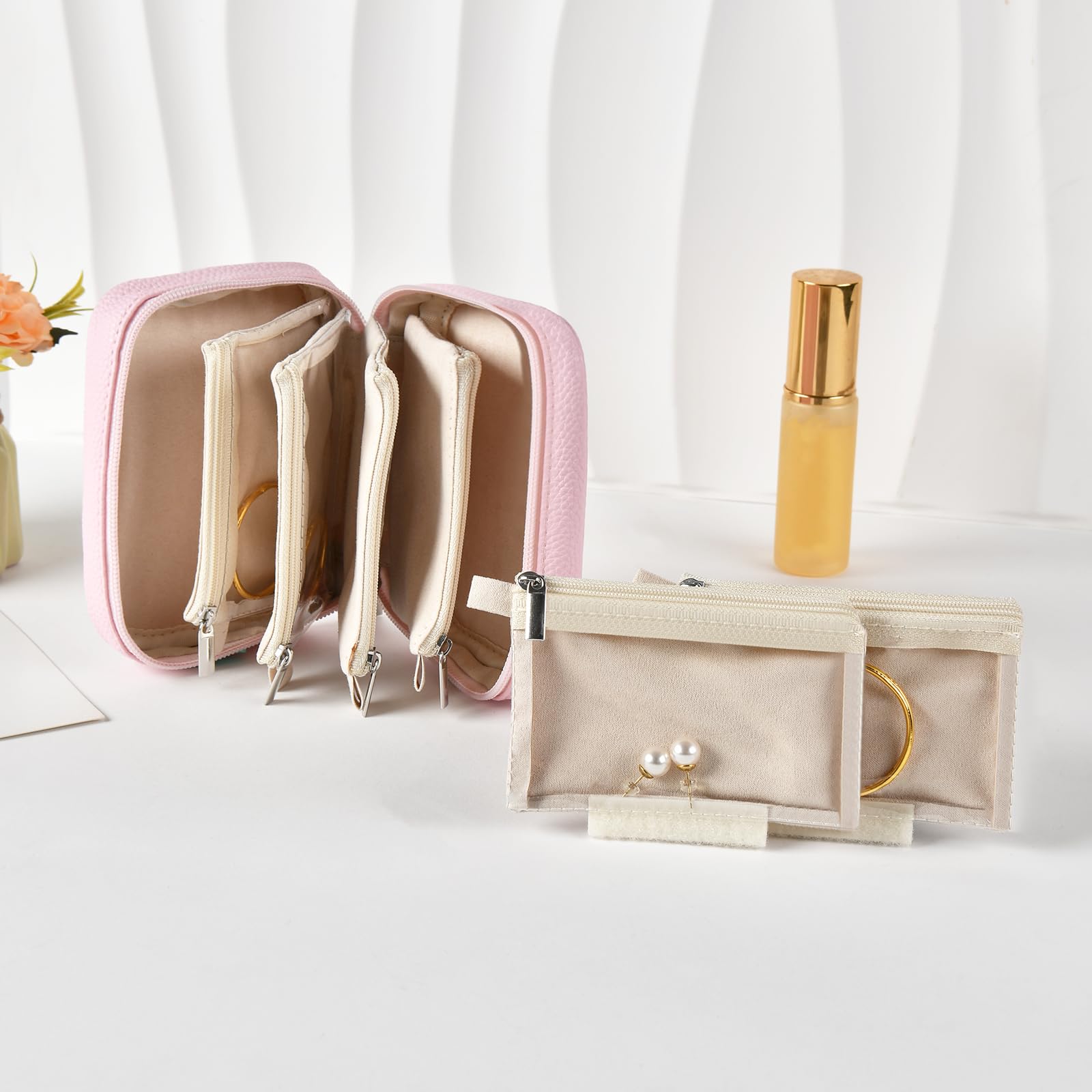 The box comes with 6 removable velvet pouches, each transparent and soft, ideal for preventing oxidation and tangling. Store rings, earrings, necklaces, bracelets, or hair clips with ease. The pouches can be used inside the box or taken out separately for travel or storing larger items.