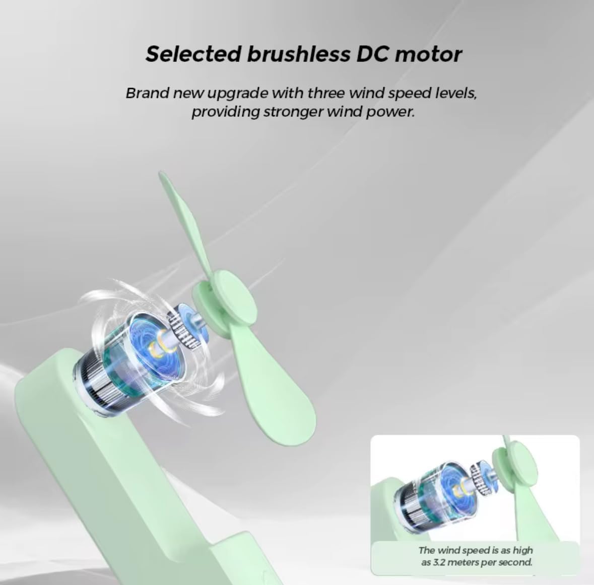 - POWERFUL MOTOR: Brushless DC motor delivers three wind speed levels up to 3.2 meters per second for effective cooling