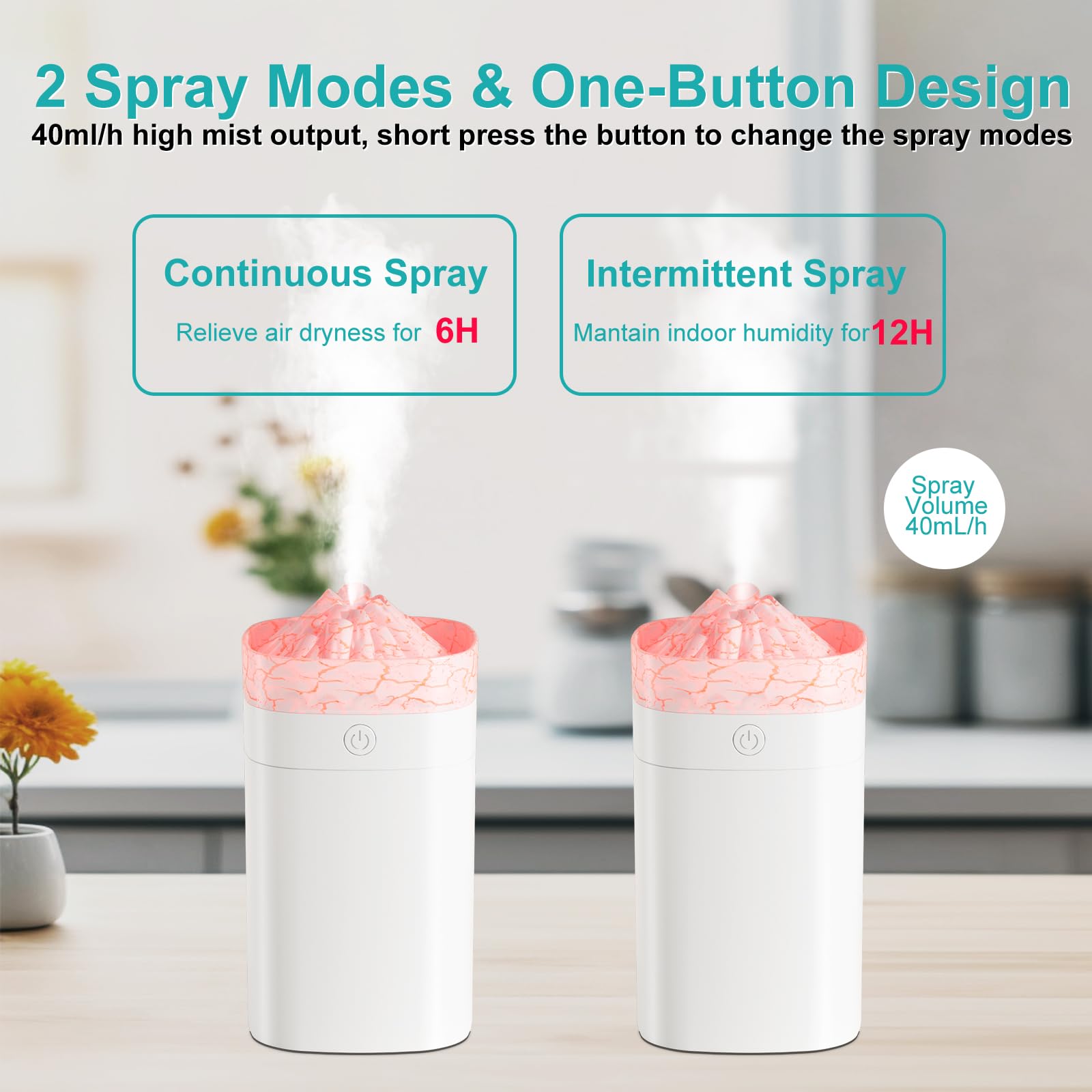 - đżăLarge Spray & USB PoweredăWith a 40ml/H mist output, this mini humidifier efficiently moisturizes the air, perfect for bedrooms or small areas. Powered by USB, itâs convenient and portable, making it a great choice for humidifiers for bedroom or on-the-go use
