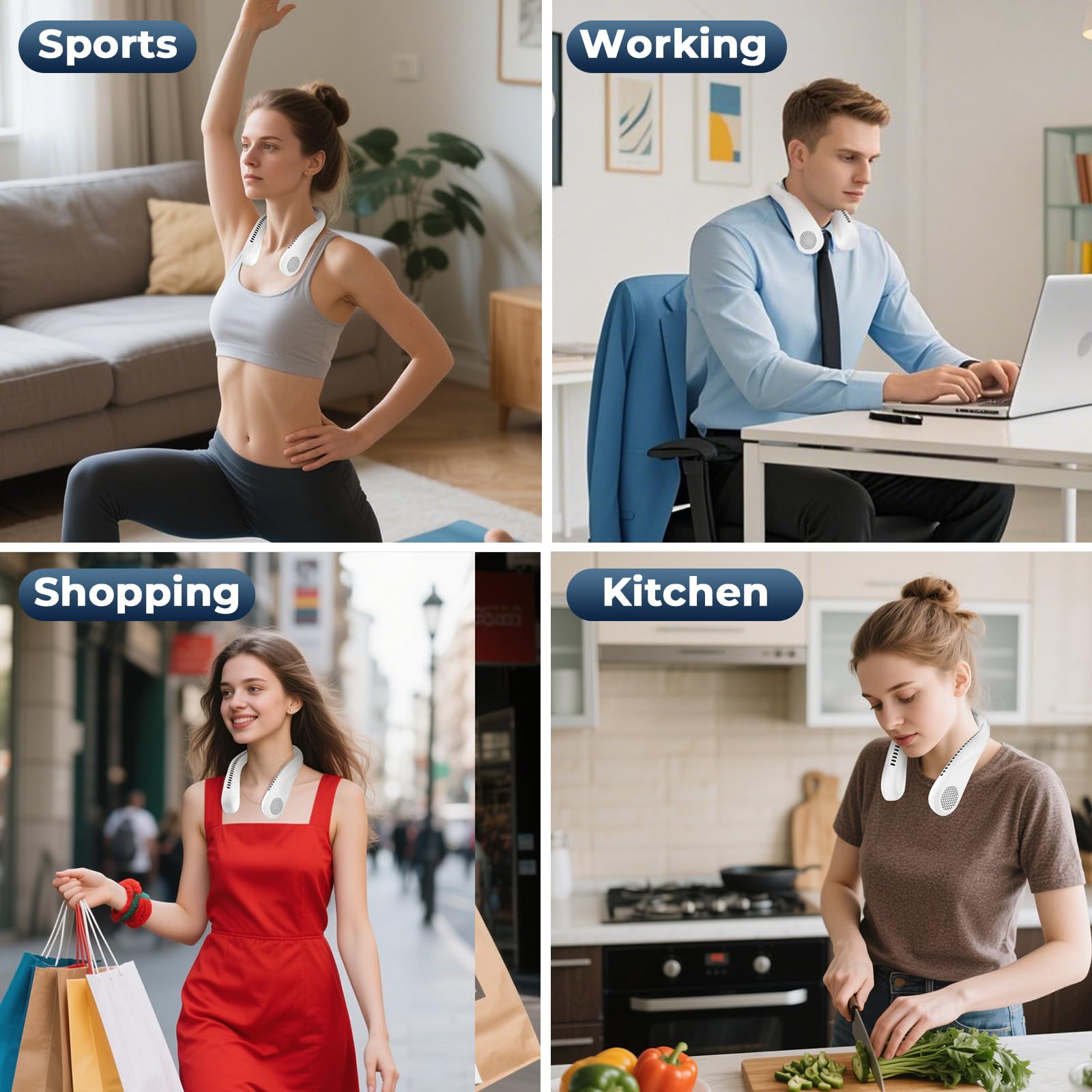 - Low Noise & Hands-Free: Personal neck fan adopts a double-sided turbine design, significantly reducing operating noise. Enjoy the coolness without disturbing you. In addition, its headphone-style appearance design frees your hands without affecting the progress of your daily activities, making it more suitable for sports, outdoor activities, travel and shopping.