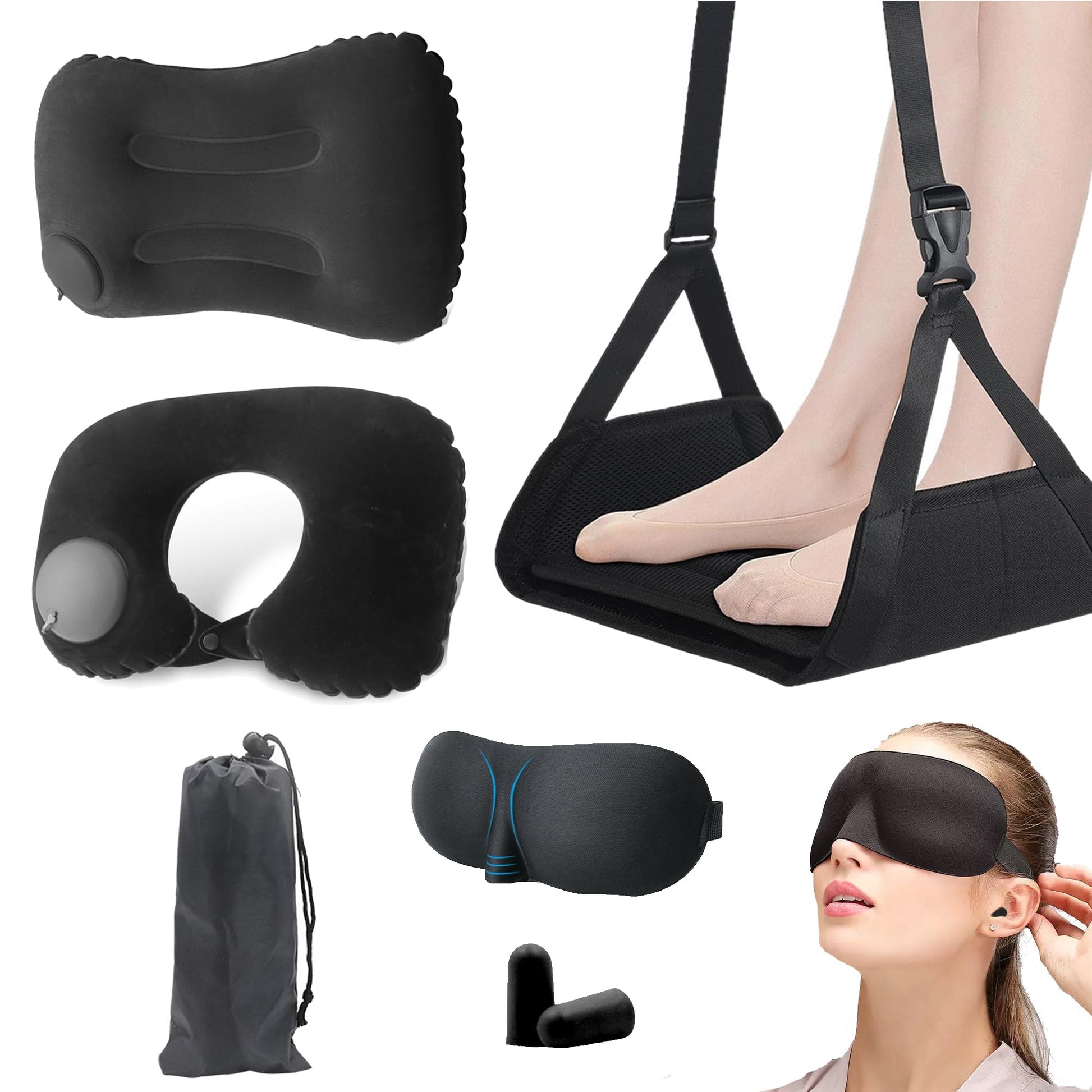 Portable Ultimate Comfort Set for Plane Sleep Kit at Plane,2 Inflatable Travel Pillows,Foot Rest Hammock,Eye Mask Ear Plugs for Airplane Flight Essentials for Seat Airplane Gadgets for Sleep Comfort