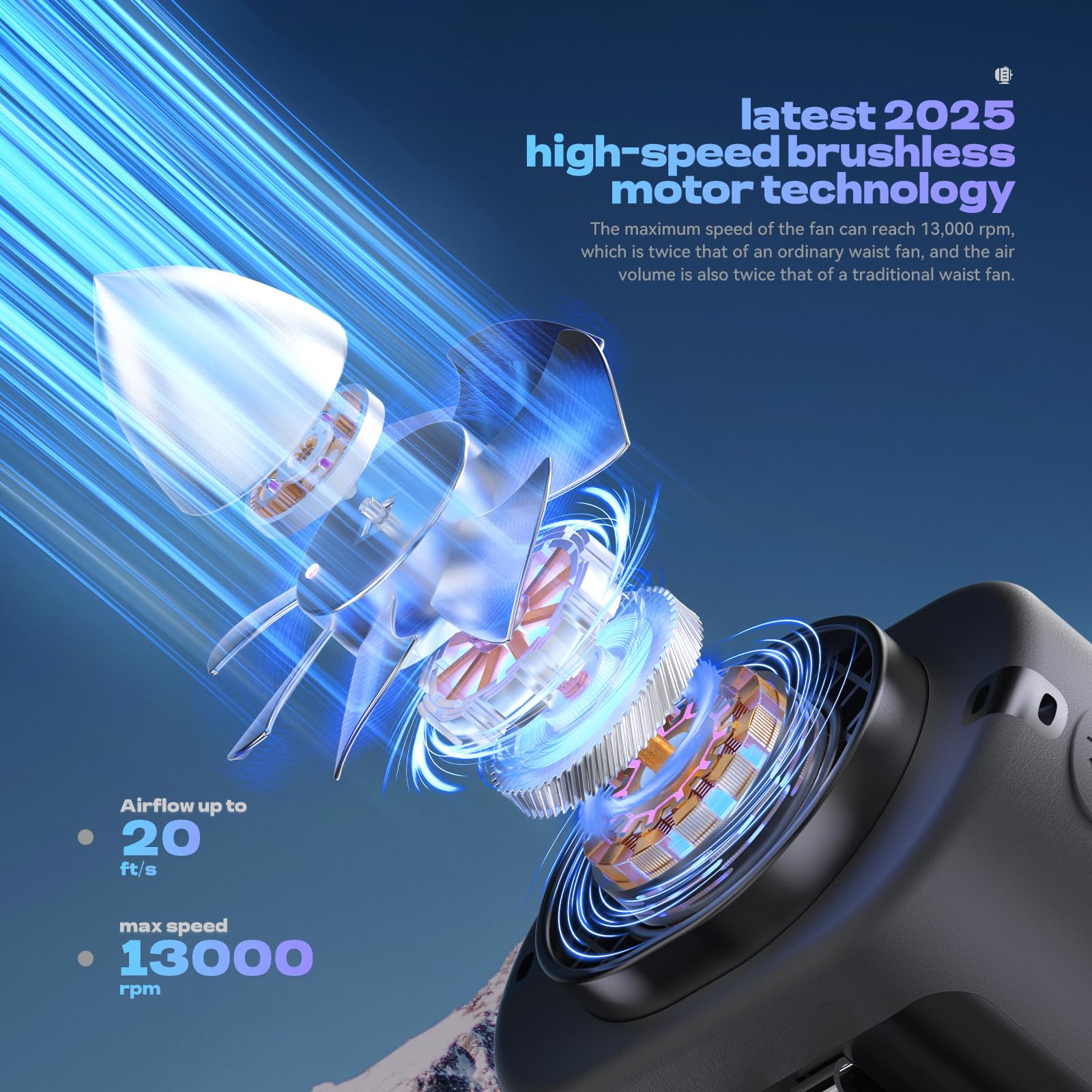 - [Fully Upgraded Portable Waist Fan] This cutting-edge waist fan features the latest 2025 brushless motor technology, achieving an impressive 13,000 RPM—twice the speed of traditional belt fans. Designed with 9 spiral blades and a streamlined, rocket-shaped structure, it minimizes air resistance, delivering a more focused and powerful airflow at speeds of up to 20 ft/s. With a simple press of the switch, you can enjoy an instant, refreshing breeze that efficiently cools you down, making hot summer days more comfortable.