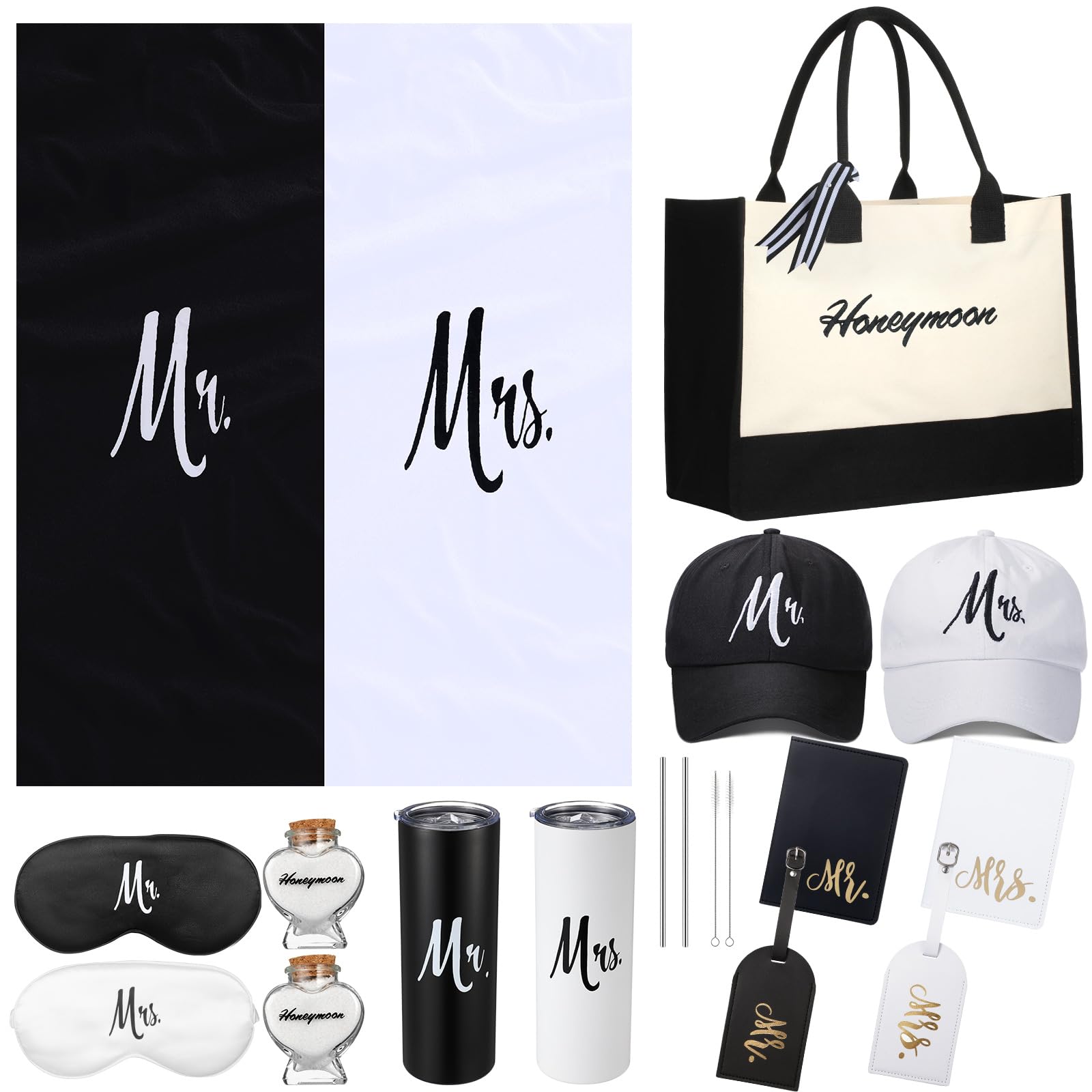 - Elegant Design: the honeymoon gifts have a beautiful design featuring [Mr. and Mrs. ] printed on the hats, travel tumblers, luggage tags, passport holders and sleep masks, while the tote bag also has the [Honeymoon] embroidered on the surface to make it more beautiful, showing an elegance that complements the couple's style
