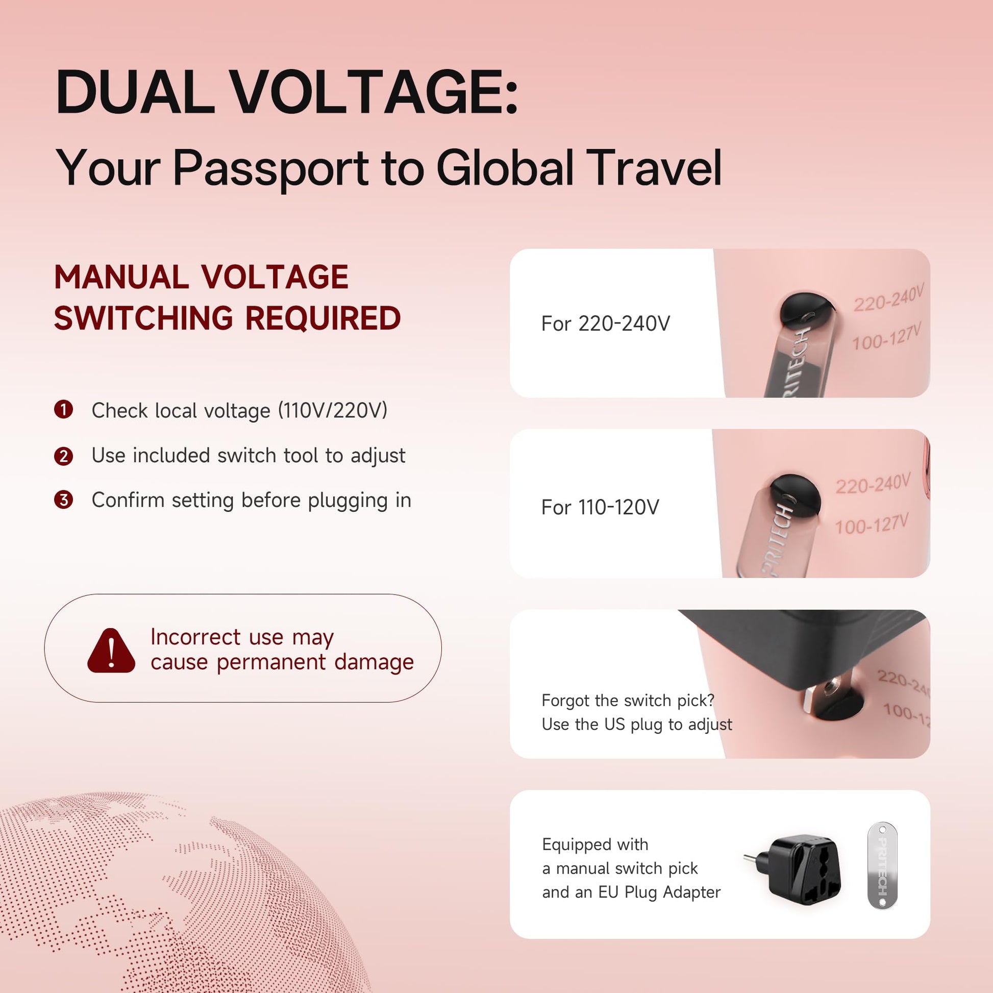 - WORLDWIDE READY & SAFE: Globally compatible design(DUAL-VOLTAGE SAFETY 110V/220V) with included EU plug adapter. Features a certified ALCI safety plug (tested to UL/IEC standards) that auto-shuts off during surges to prevent electrical hazards. ** IMPORTANT: USE THE INCLUDED VOLTAGE SWITCH TOOL TO MANUALLY SELECT 110V OR 220V BEFORE PLUGGING IN. ** Includes travel bag for portability.