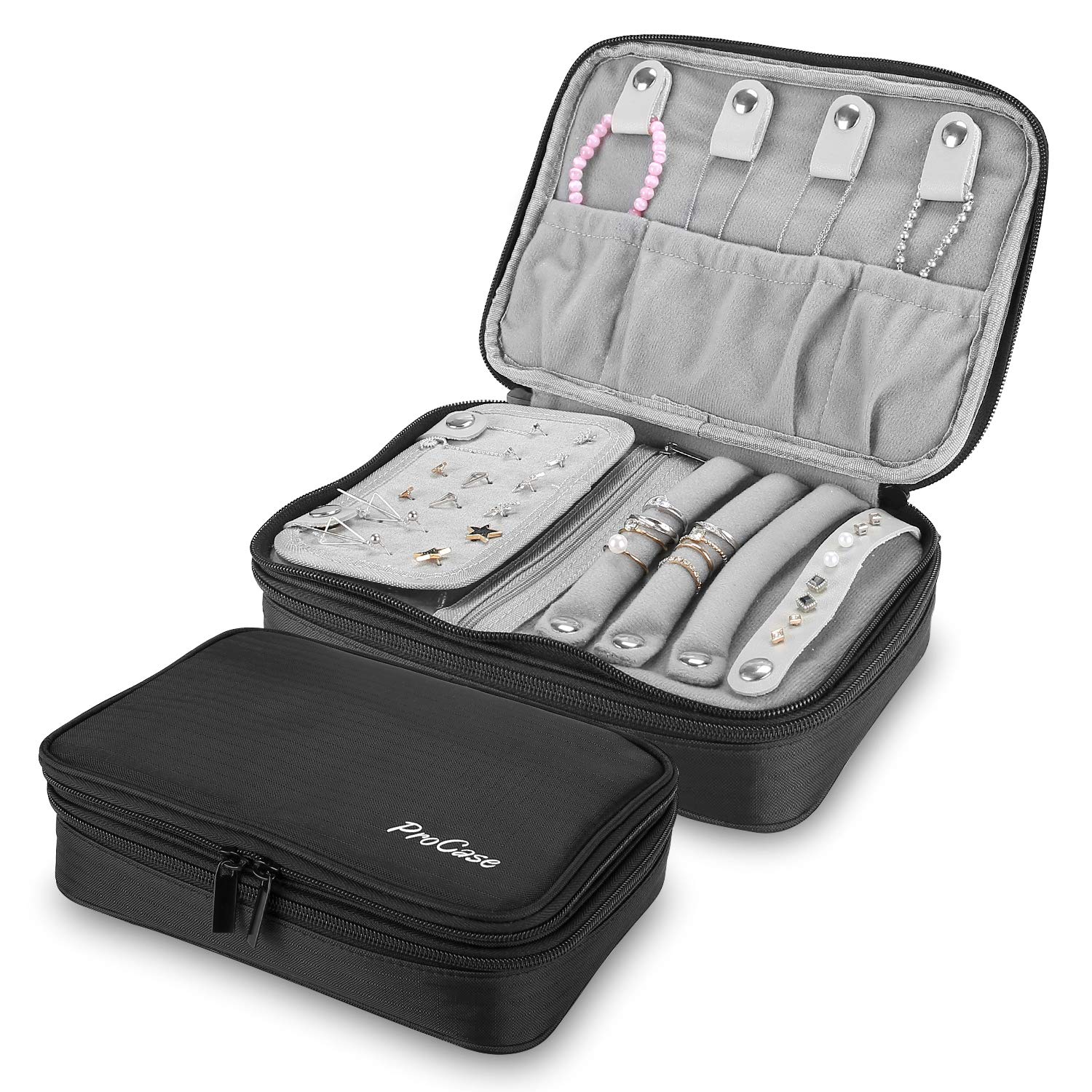 The ProCase Travel Jewelry Case is perfect for storing, protecting, and organizing your jewelry when you're on the go. It features a large compartment and multiple necklace straps, ring straps, and earring panels to carry what you need for on-the-go and keep it all in one place and neatly organized. It is very useful for those who travel a lot.
