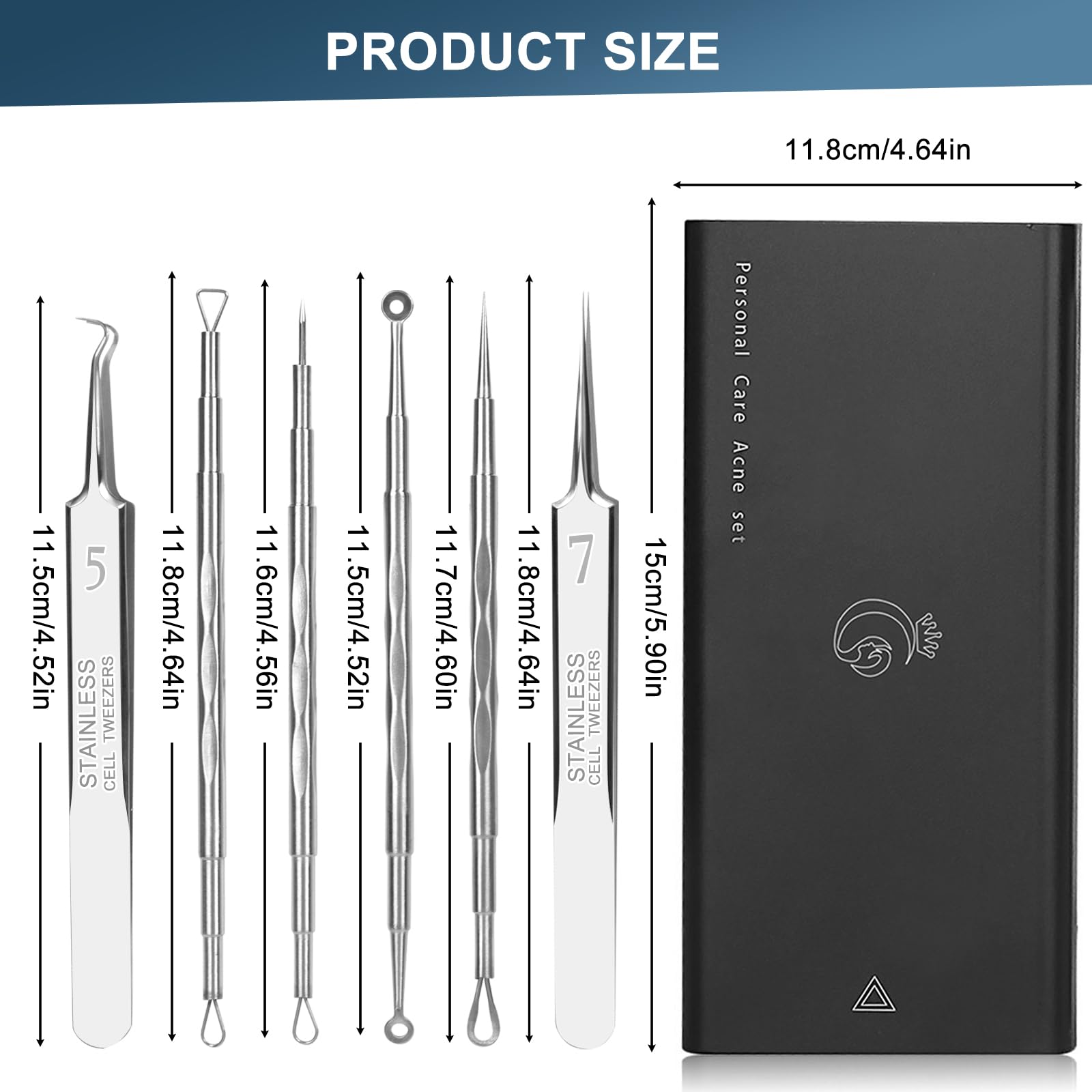 Details: This professional 6-piece blackhead removal set includes precision-crafted stainless steel tools designed for safe and effective blemish extraction. The kit features specialized implements including angled tweezers and various loop extractors to address different types of skin concerns. Each tool is made from high-quality stainless steel that's both durable and easy to clean. The set comes complete with a sleek storage case to keep your tools organized and protected. The ergonomic design of each tool provides excellent control and precision during use. Perfect for skincare enthusiasts who prefer to maintain their complexion at home, this set includes differently sized tools to tackle various types of blemishes. The compact case makes it convenient for travel while protecting the tools from damage. For best results, always clean and sterilize tools before and after each use.