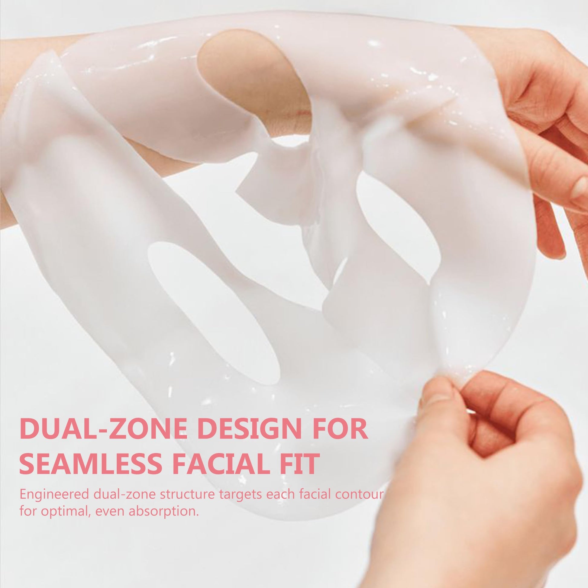 - Innovative Split-Type Design, Perfect Fit-A standout feature of our mask is its innovative split-type design, which ensures an impeccable fit to the unique contours of your face. This design maximizes the absorption of the collagen essence, delivering targeted care to every area of your skin and enhancing the overall efficacy of the treatment.