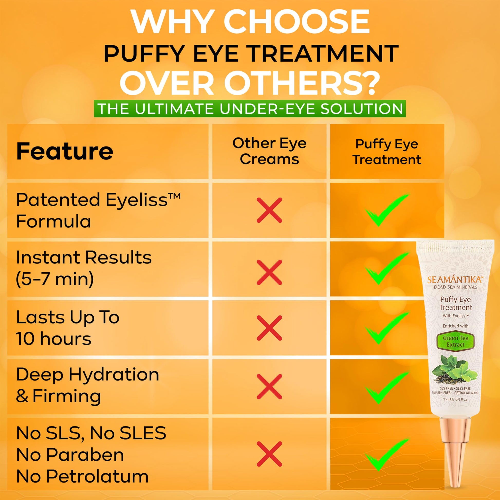 Puffy Eye Treatment Instant results – Naturally Eliminate Wrinkles, Puffiness, Dark Circle and Bags in Minutes – Hydrating Eye Cream w/ Green Tea Extract, Dead Sea Minerals by SEAMANTIKA – .8 fl.oz.