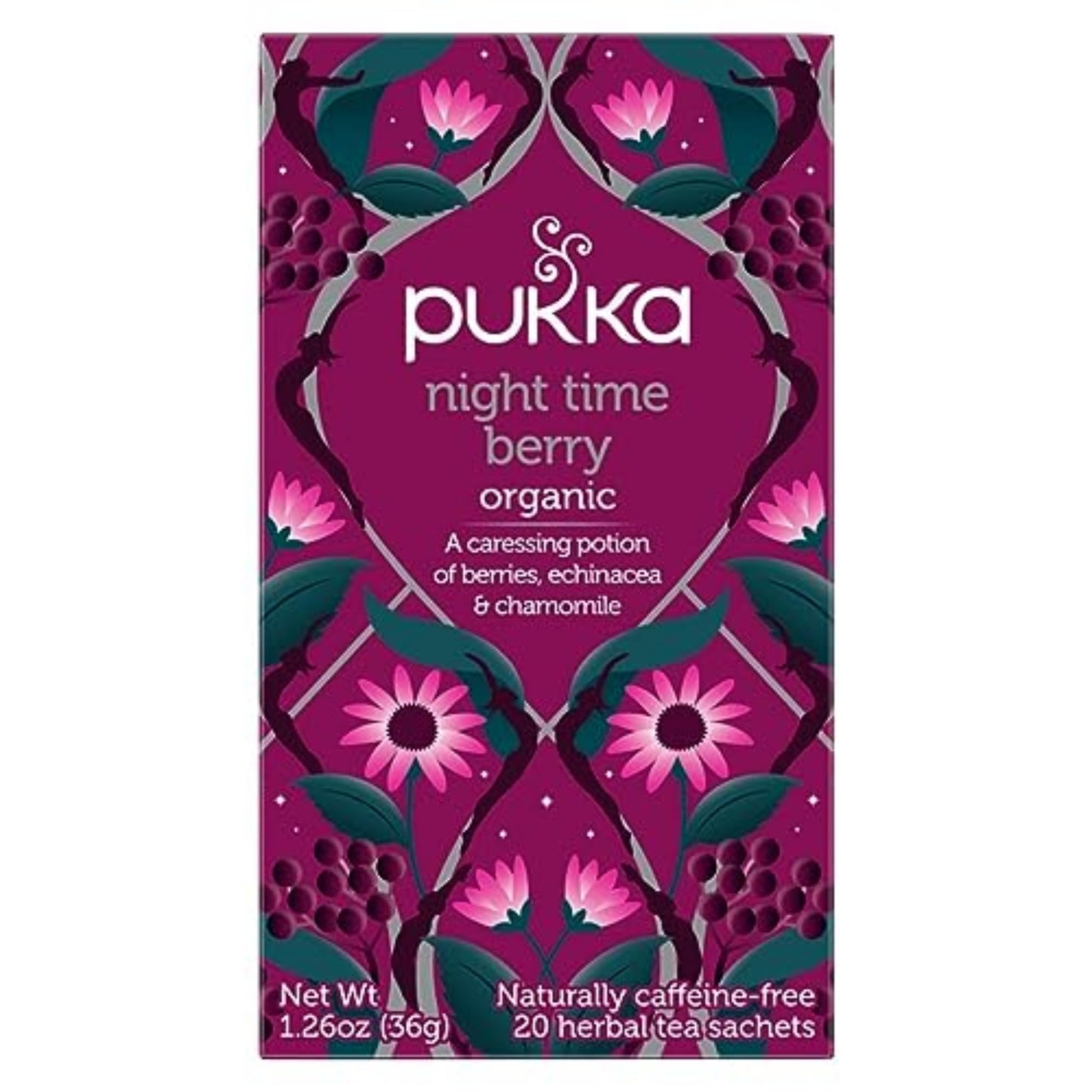 - PUKKA NIGHT TIME BERRY: Indulge in this organic tea crafted with fruity elderberry and blackcurrant ingredients blended with the subtle floral notes of echinacea, chamomile, and lavender and the sweet tones of licorice and valerian