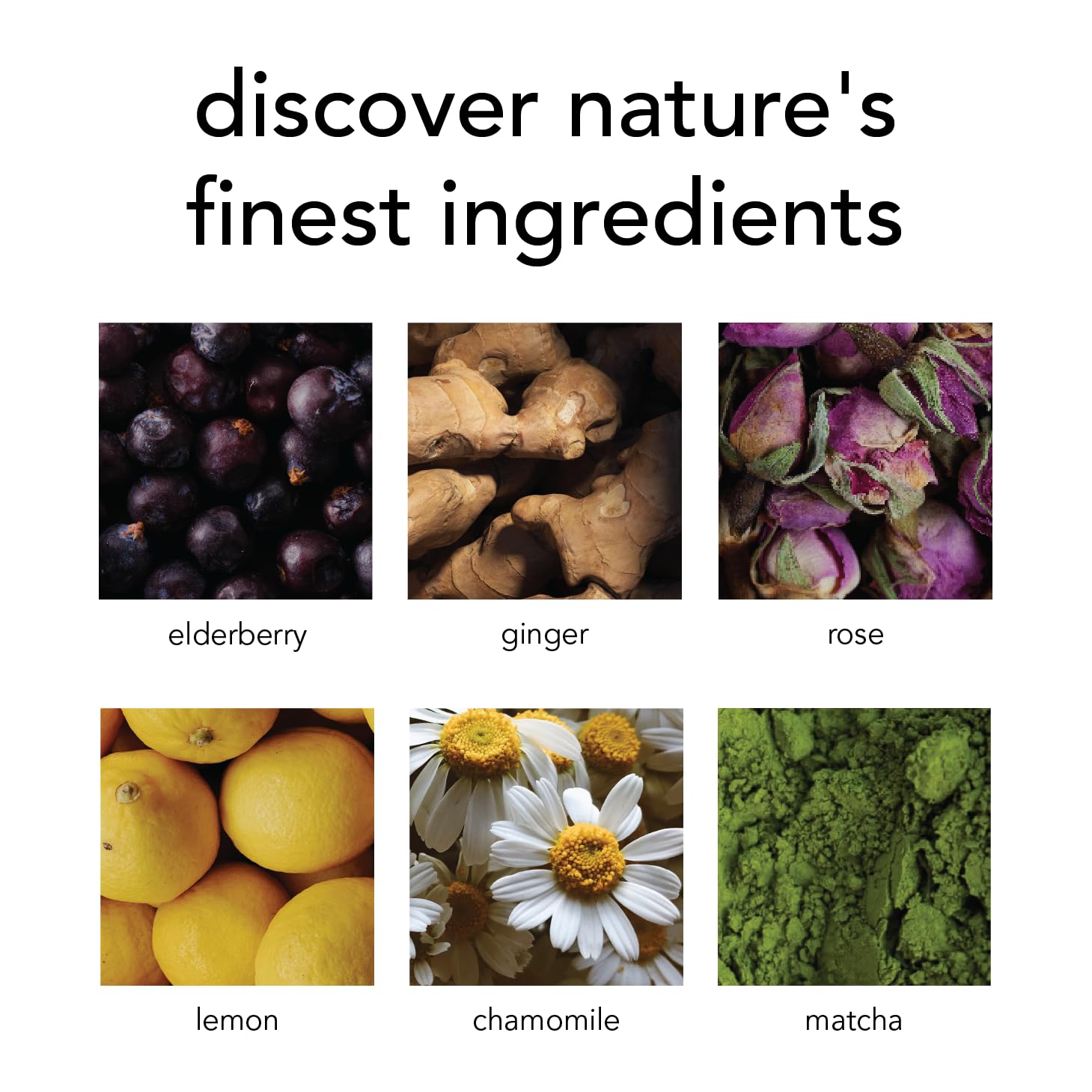 - A selection of nine herbal teas: Supreme Matcha Green, Turmeric Gold, Feel New, Elderberry & Echinacea, Lemon, Ginger & Manuka Honey, Love, Peppermint & Licorice, Three Ginger and Night time