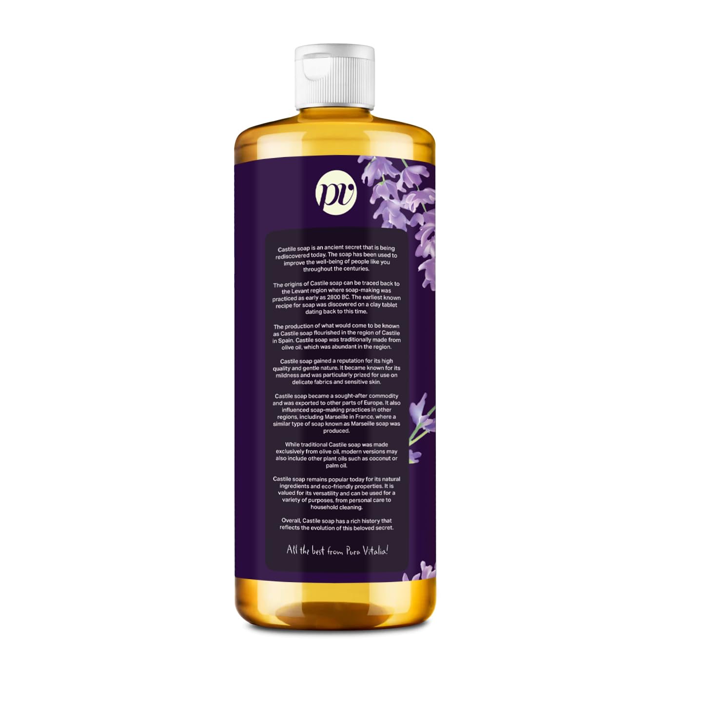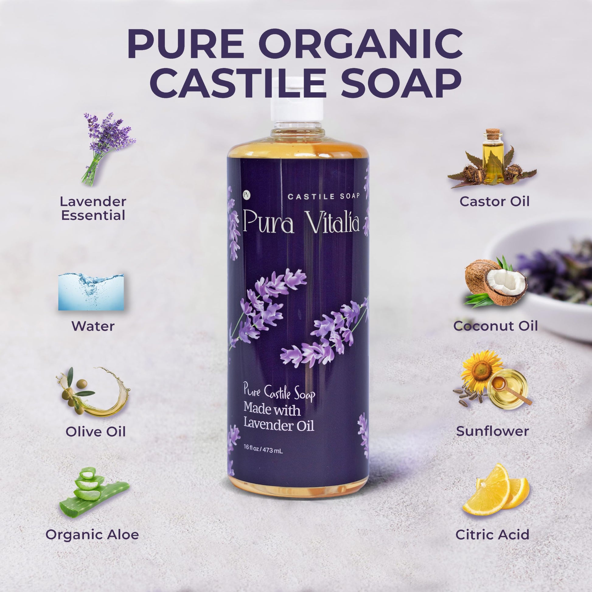 Pura Vitalia Lavender Organic Castile Soap | Body Wash & Cleanser for Face & Hands | Biodegradable, Eco-Friendly, Palm Oil Free, Vegan & Gentle | Made with 6 Natural Ingredients - 32 oz