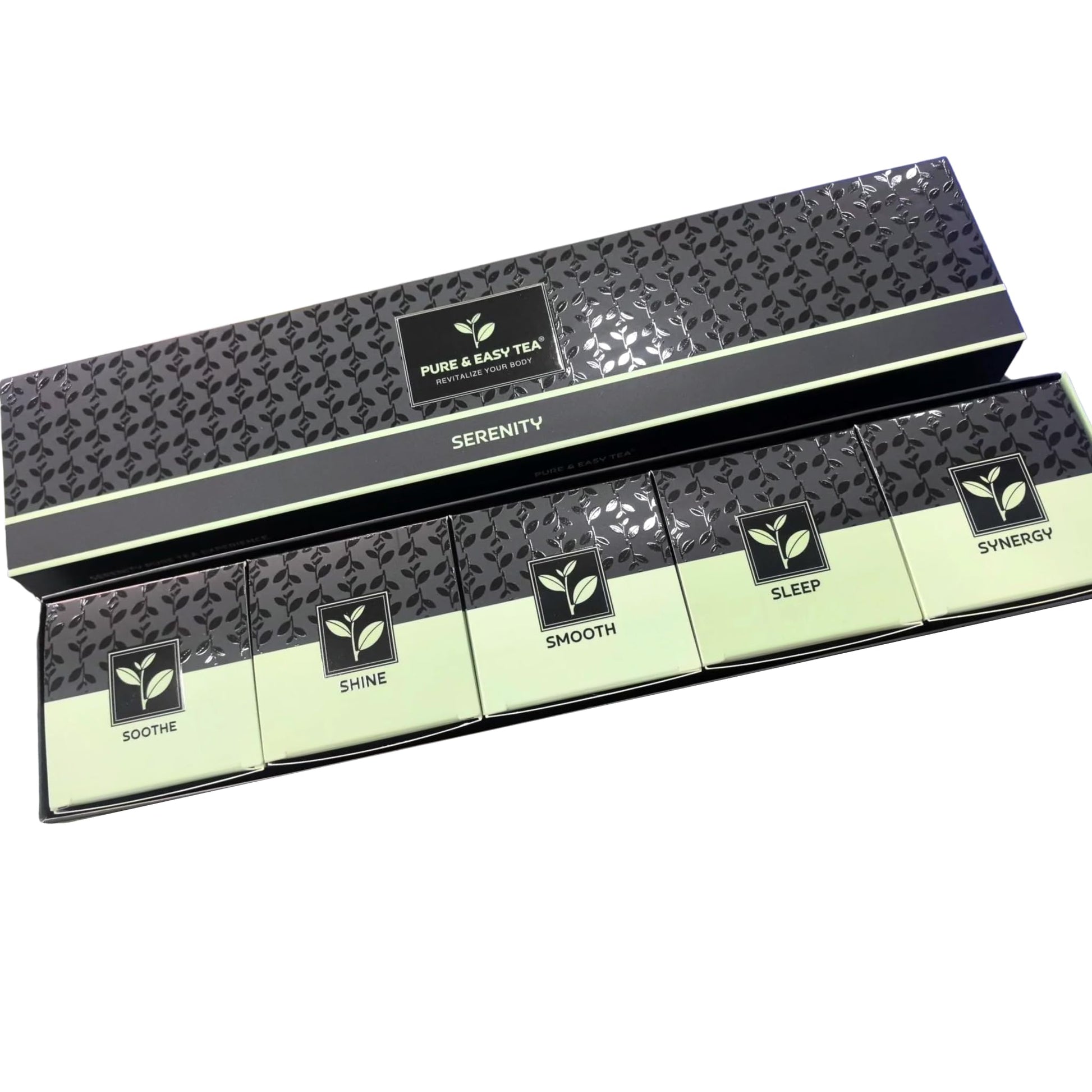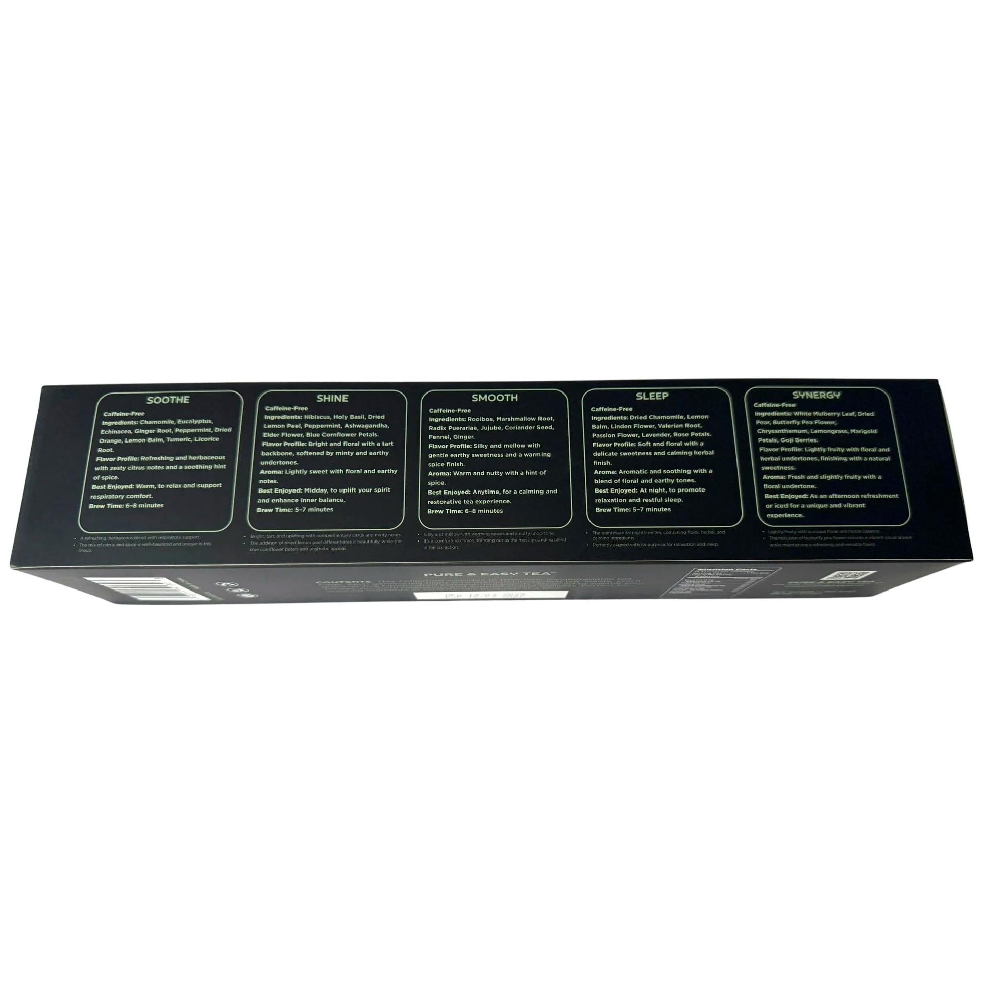 - đż Five Soothing Herbal Blends: This premium caffeine-free tea sampler features five wellness-inspired blends â Soothe, Shine, Smooth, Sleep, and Synergy â crafted to support relaxation, digestion, balance, and better sleep.