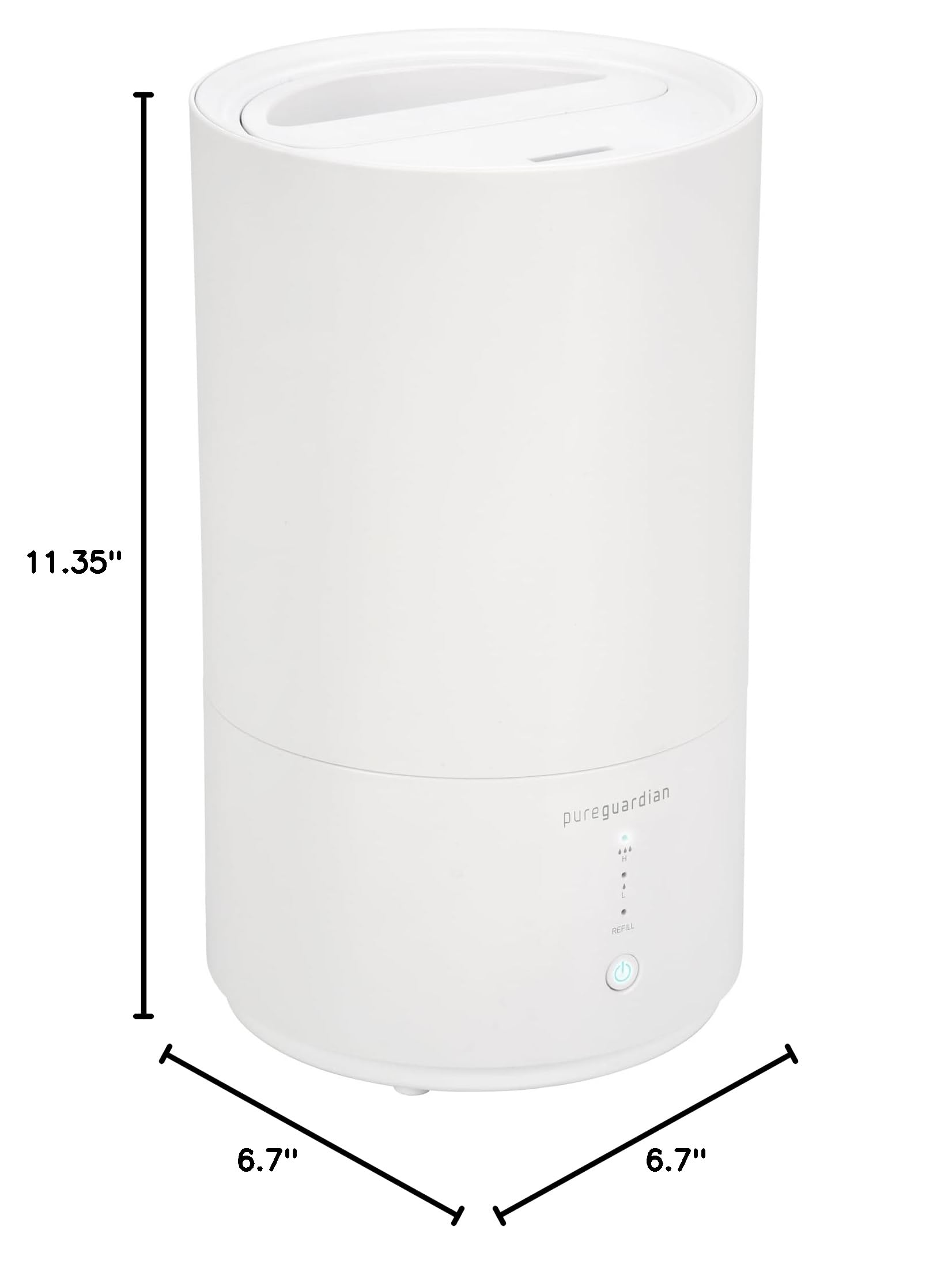 Details: From the air purification experts at GermGuardian, PureGuardian humidifiers are designed to provide relief from the problems that accompany dry household air, such as colds, allergies, coughs, sore throats, and dry skin. The ultrasonic technology in the H950AR humidifier uses high frequency vibrations to vaporize water without the need for heat-based evaporation, allowing it to disperse a cool, soothing mist that won't make your living space feel hot or muggy. Designed with sleep in mind, this ultrasonic humidifier runs quietly and has the tank capacity to run all night. Thanks to its low-water indicator and auto-shut off switch, the unit will let you know when it needs more water, so you don’t have to worry about monitoring it in between fills. With its compact design and 0.8-gallon tank, the H950AR is ideal for small to medium sized rooms. Best of all, the top-fill design avoids the need for messy, cumbersome upside-down refilling and allows you to easily access the tank interior for cleaning. Silver Clean protection keeps the tank fresh in between cleanings. This unit also features an aromatherapy tray and oil pad, allowing you to use the humidifier to diffuse your favorite essential oils, turning a dry home, office, dorm, nursery, or bedroom into a tranquil, spa-like oasis. Also features two-speed mist control. Essential oil not included.