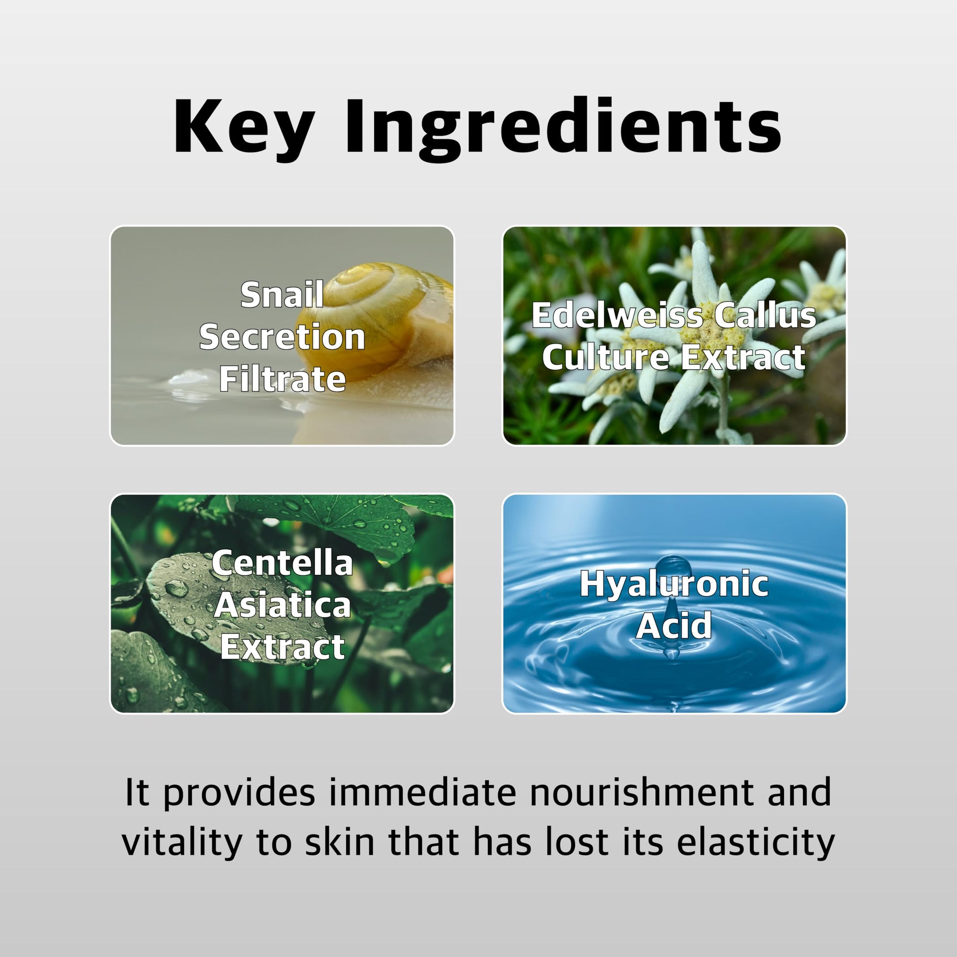 - FIRMING + ANTI AGING SERUM AMPOULE - Brings vitality to skin that has lost its elasticity, with a nutrient texture that penetrates tightly immediately. Snail mucus filtrate and Edelweiss Callus culture extracts nourish skin with reduced elasticity and lack of moisture, making it healthy and lively.