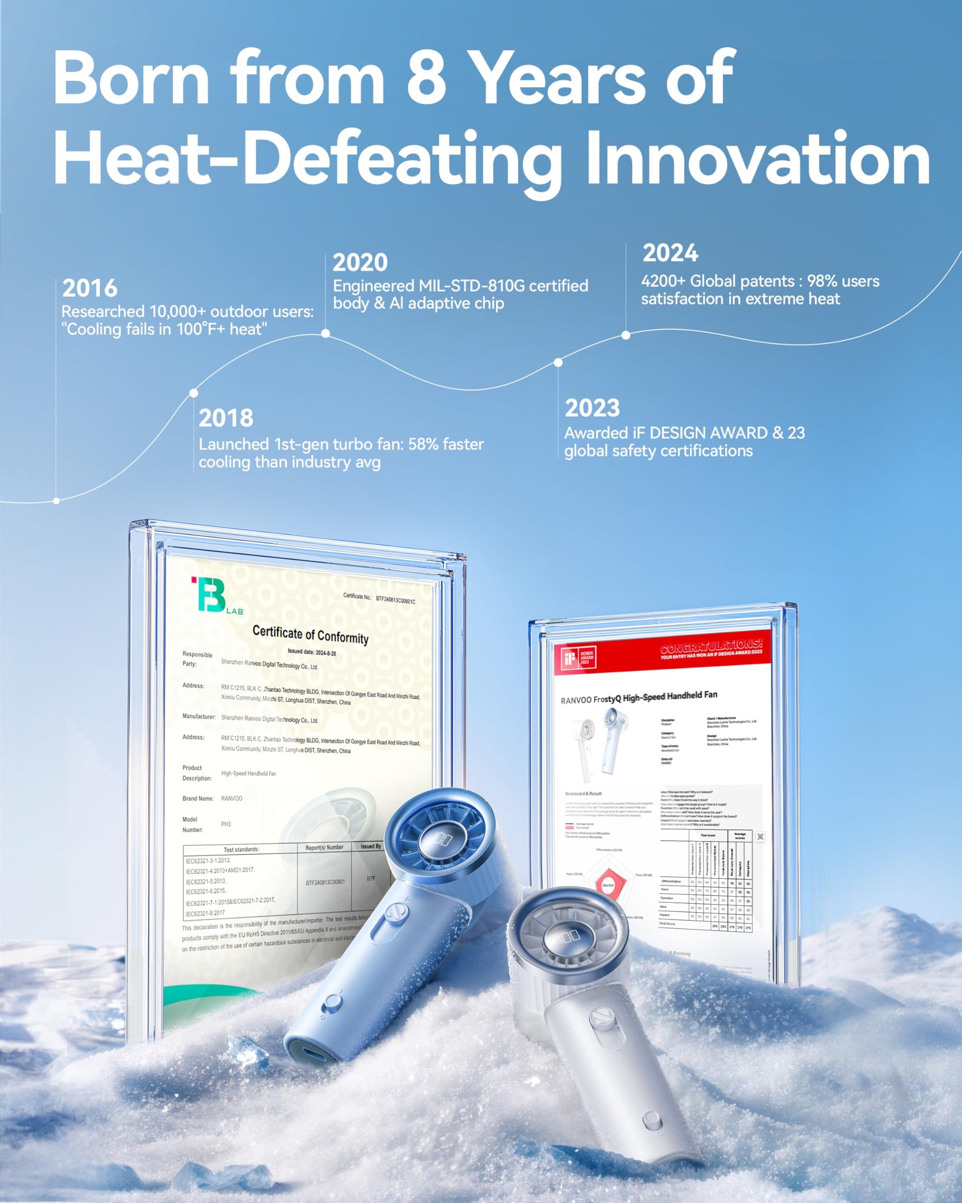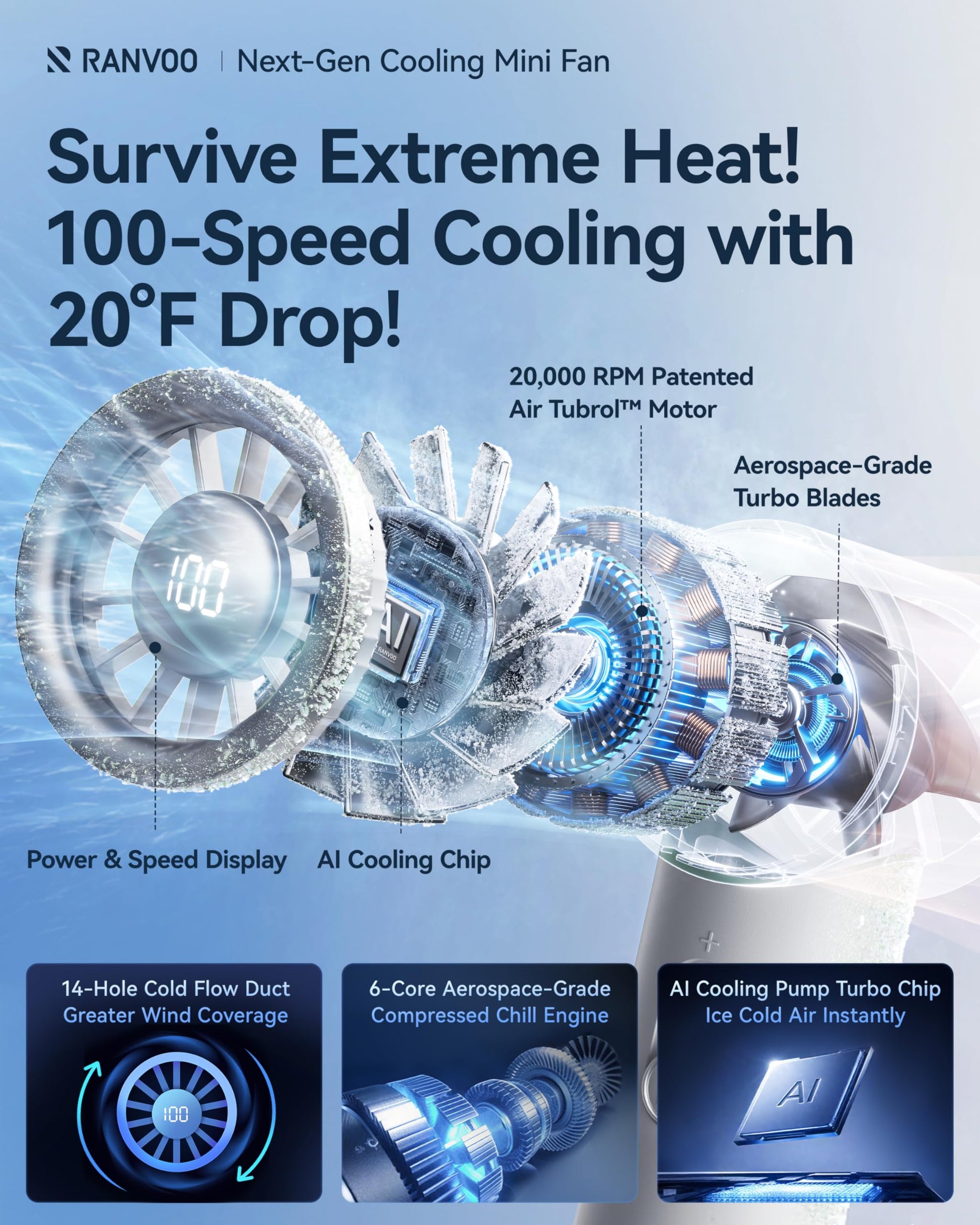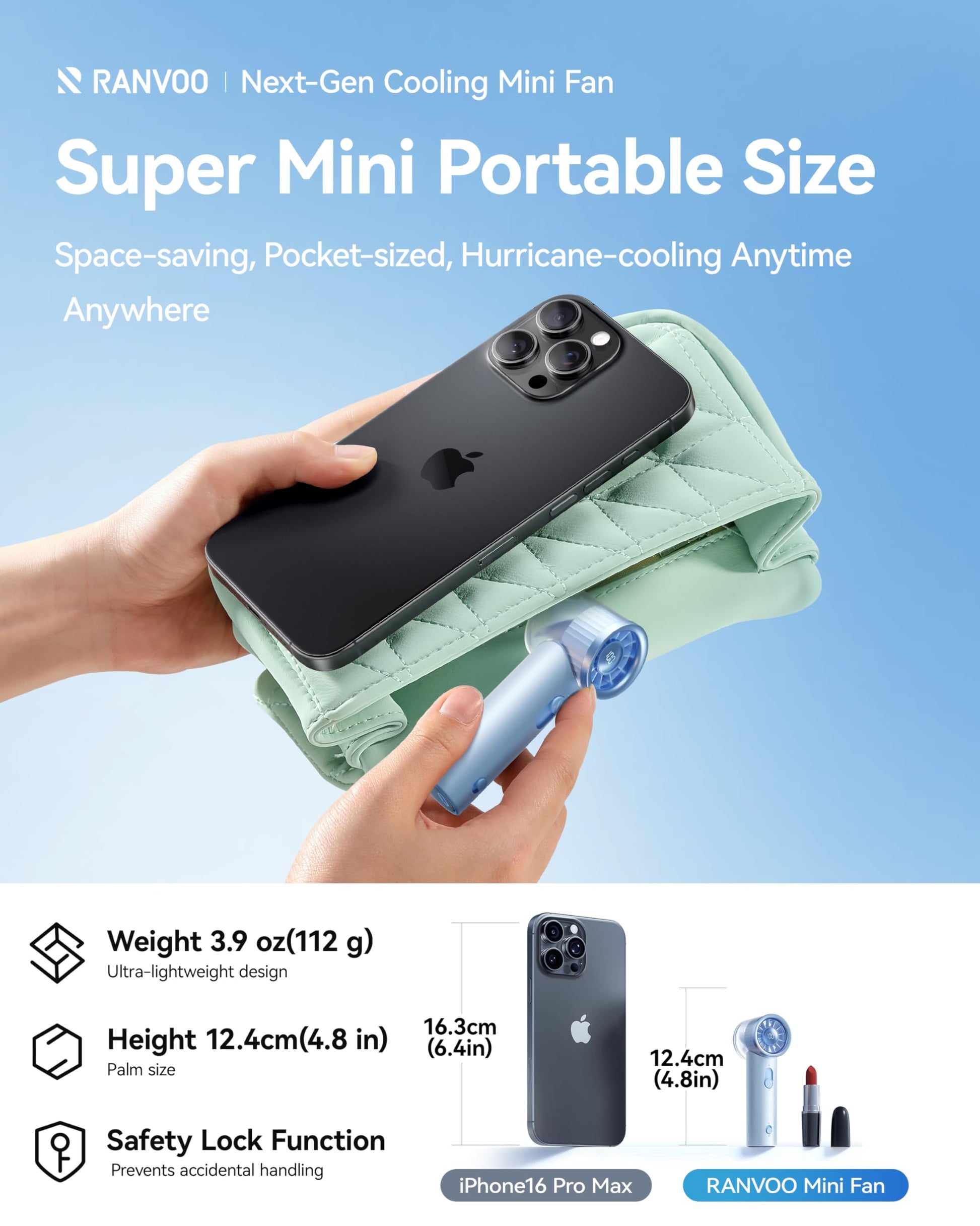 - Powerful Cold Wind - 20°F Drop in 1s: The portable fan uses a German-designed super-turbine engine and large-diameter turbine blades, with a mini fan speed of up to 20,000 RPM, releasing a hurricane-level 10 m/s cold airflow, 3x faster than a regular mini fan. The two-way circulation air duct and 180° wide-angle airflow design make the cold wind cover a wider range. The handheld fan’s super cooling effect allows you to quickly cool down during summer travel, hot outdoor camping, and sports and fitness, and enjoy a personal oasis!