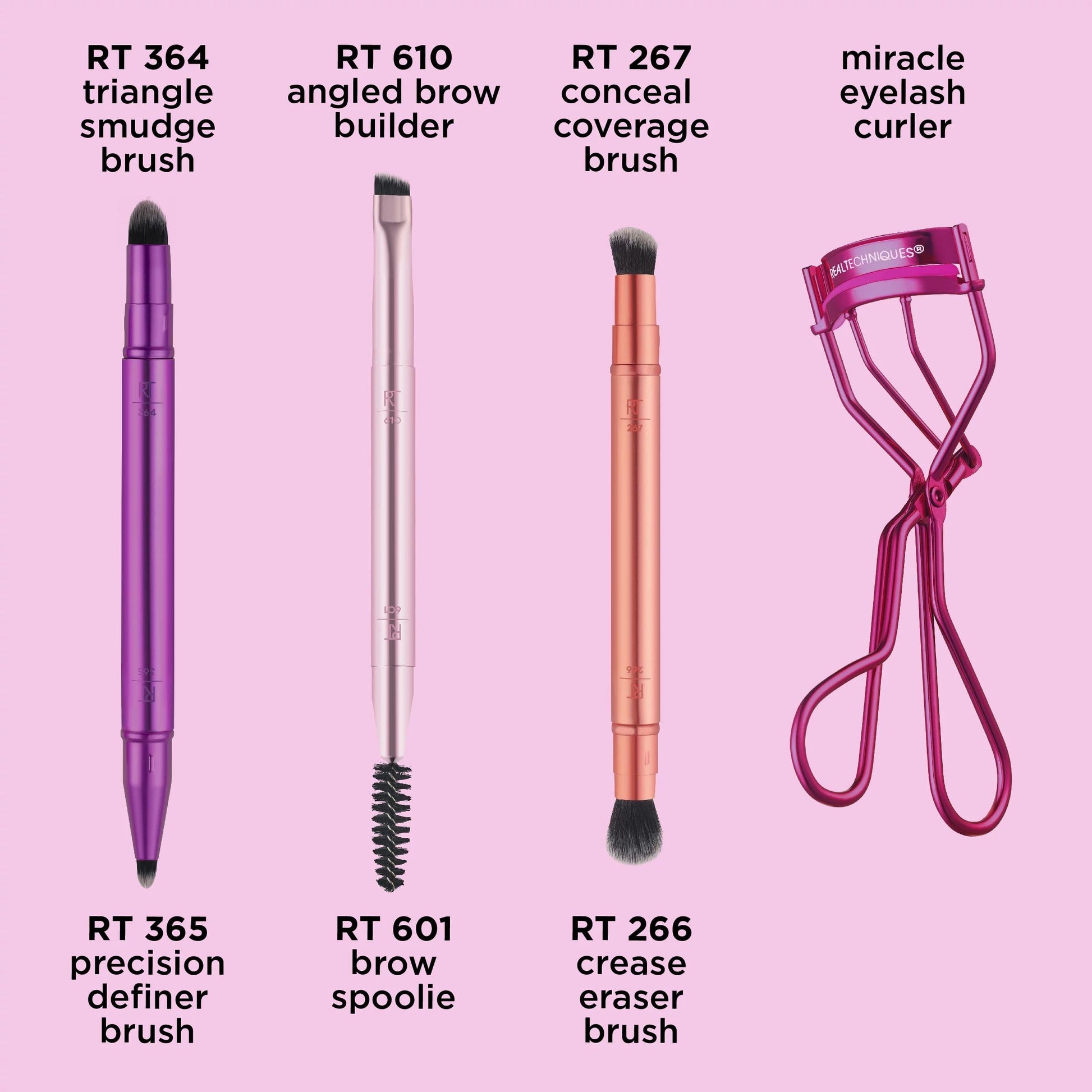 - Real Techniques Double Time Brush + Lash Set includes: (1) Triangle Smudge Brush + Precision Definer Brush, (1) Angled Brow Builder + Brow Spoolie, (1) Crease Eraser Brush + Conceal Coverage Brush, & (1) Miracle Eyelash Curler