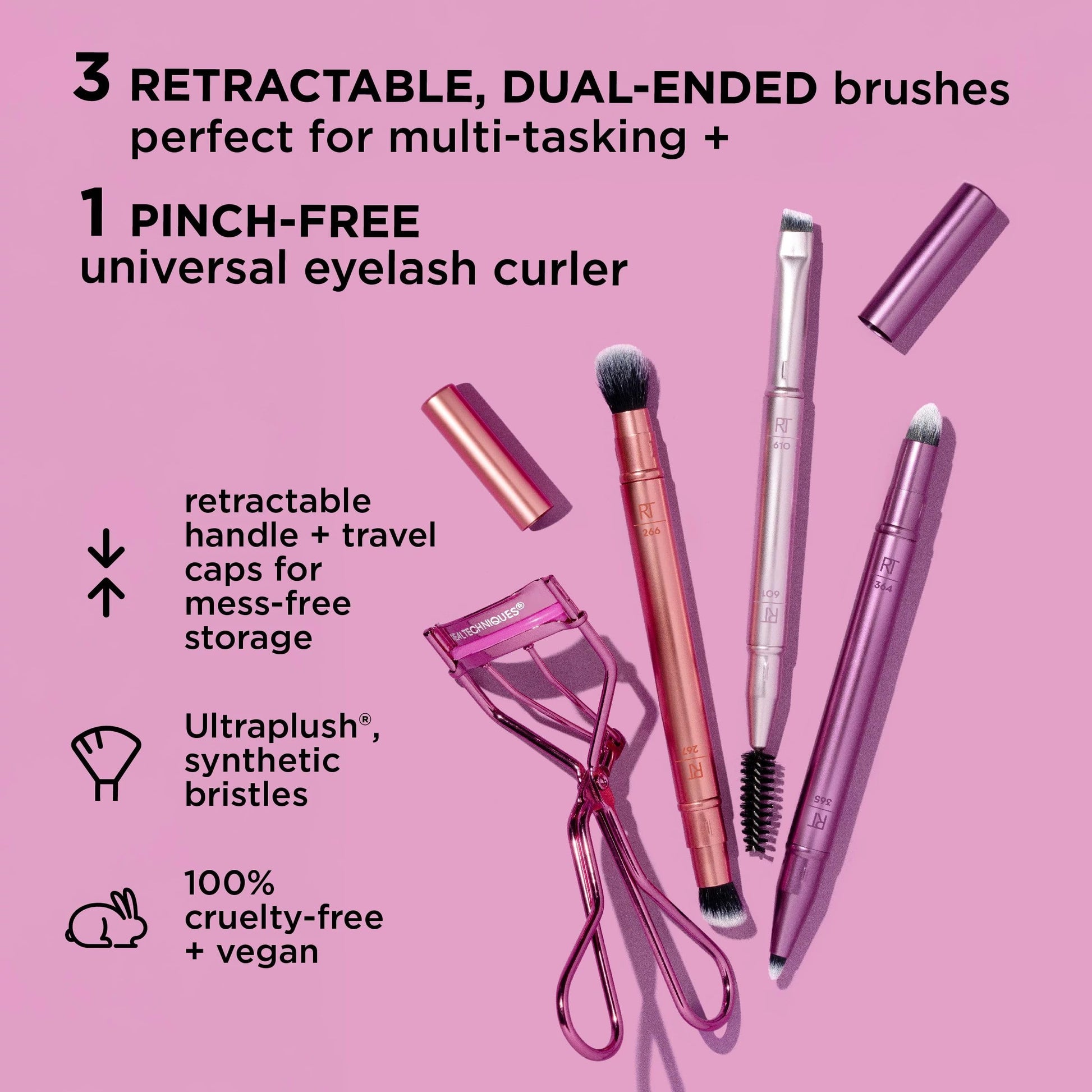 Details: The Real Techniques Double Time Brush + Lash Set is the perfect travel set for your next get away. This set features 3 dual-ended makeup brushes for multi-tasking and an eyelash curler for lifted lashes. Each brush includes travel caps for mess-free, easy storage. The makeup brush set includes the 364 Triangle Smudge Brush + 365 Precision Definer Brush, 610 Angled Brow Builder + 601 Brow Spoolie, 266 Crease Eraser Brush + 267 Conceal Coverage Brush, and our Miracle Eyelash Curler. The brushes can be used with liquid, cream, and powder makeup such as eyeshadow, brow gel, brow pomade, eyeliner, and concealer. Our lash curler provides a gentle, natural-looking lash lift as the final touch to your routine. The Double Time brushes are easy to clean using our Real Techniques Brush + Sponge Cleansing Gel. They’re also 100% cruelty-free and made with UltraPlush synthetic bristles. We are Real Techniques, the brand of choice for all makeup users, no matter your level of expertise. Created in collaboration with leading makeup artists, we aspire to take the mystery out of choosing beauty tools so you can focus more time on putting your best face forward one blend at a time. From full makeup looks, to quick beauty hacks, RT brushes + sponges are exceptionally high quality for professional looking results every time. BUT… don’t be fooled by our affordable prices, RT tools are award-winning + purposefully designed because that’s what you deserve. Quality without compromise.