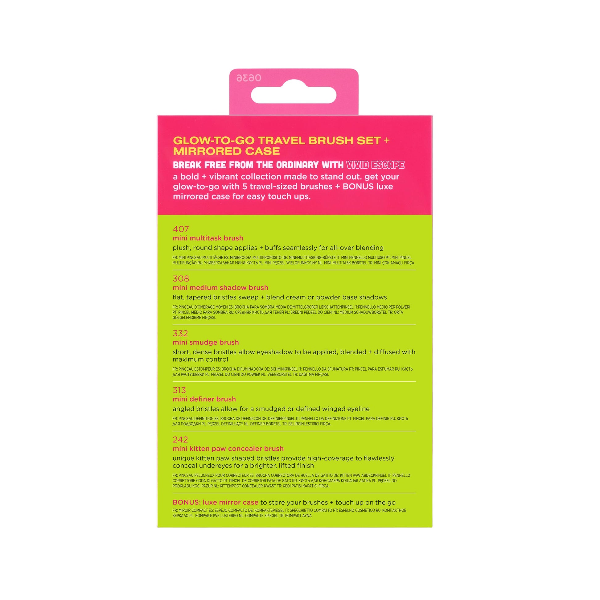Details: Break free from the ordinary with the Real Techniques Glow-To-Go Travel Brush Set featuring 5 mini makeup brushes to effortlessly blend, conceal, and shade for a natural, flawless base and a compact mirror for travel-friendly touch ups. This makeup brush set includes the 407 Mini Multitask Brush, 308 Mini Medium Shadow Brush, 332 Mini Smudge Brush, 313 Mini Definer Brush, 242 Mini Kitten Paw Concealer Brush, and Luxe Mirror Case. Each makeup brush works with liquid, cream, and powder products such as foundation, concealer, setting powder, highlighter, and more. Try all the products from our limited-edition Vivid Escape Collection - bold and vibrant tools made to stand out. Makeup brushes are easy to clean using our Real Techniques Brush + Sponge Cleansing Gel. They’re also 100% cruelty-free, vegan, and designed with UltraPlush, synthetic bristles. We are Real Techniques, the brand of choice for all makeup users, no matter your level of expertise. Created in collaboration with leading makeup artists, we aspire to take the mystery out of choosing beauty tools so you can focus more time on putting your best face forward one blend at a time. From full makeup looks, to quick beauty hacks, RT brushes + sponges are exceptionally high quality for professional looking results every time. BUT… don’t be fooled by our affordable prices, RT tools are award-winning + purposefully designed because that’s what you deserve. Quality without compromise.