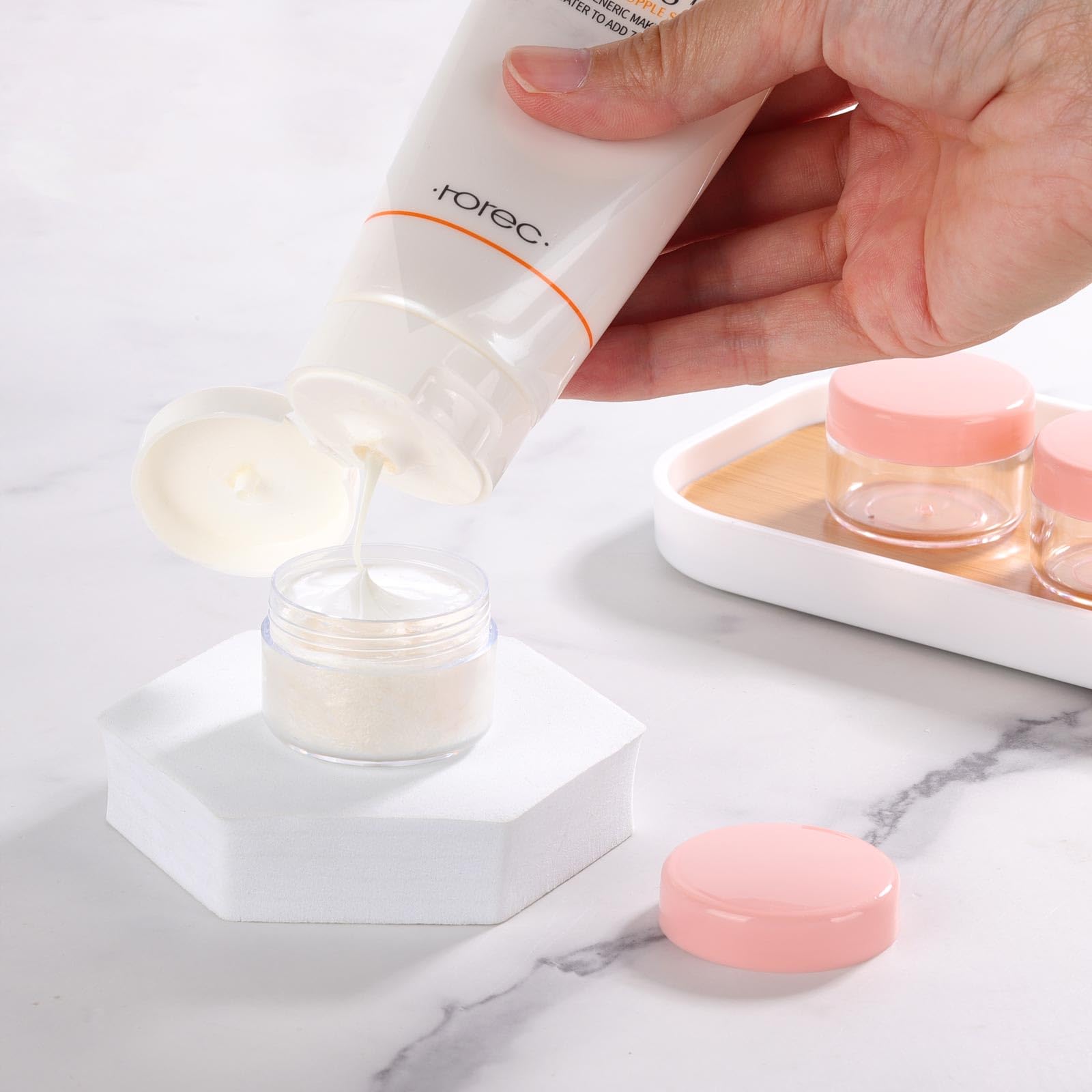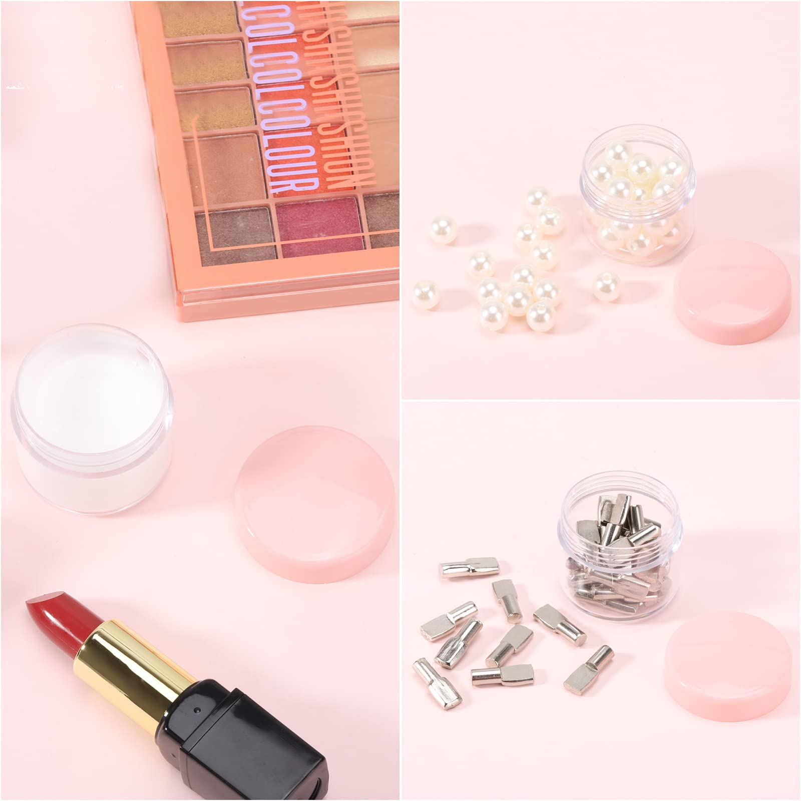 Details: Refillable Cosmetic Jars Plastic Sample Containers with Lids;Perfect for storing creams, lotions, cosmetics, lip balms, lip glosses, scrubs, salves, nail accessories, charms, beads, small jewelry and more.