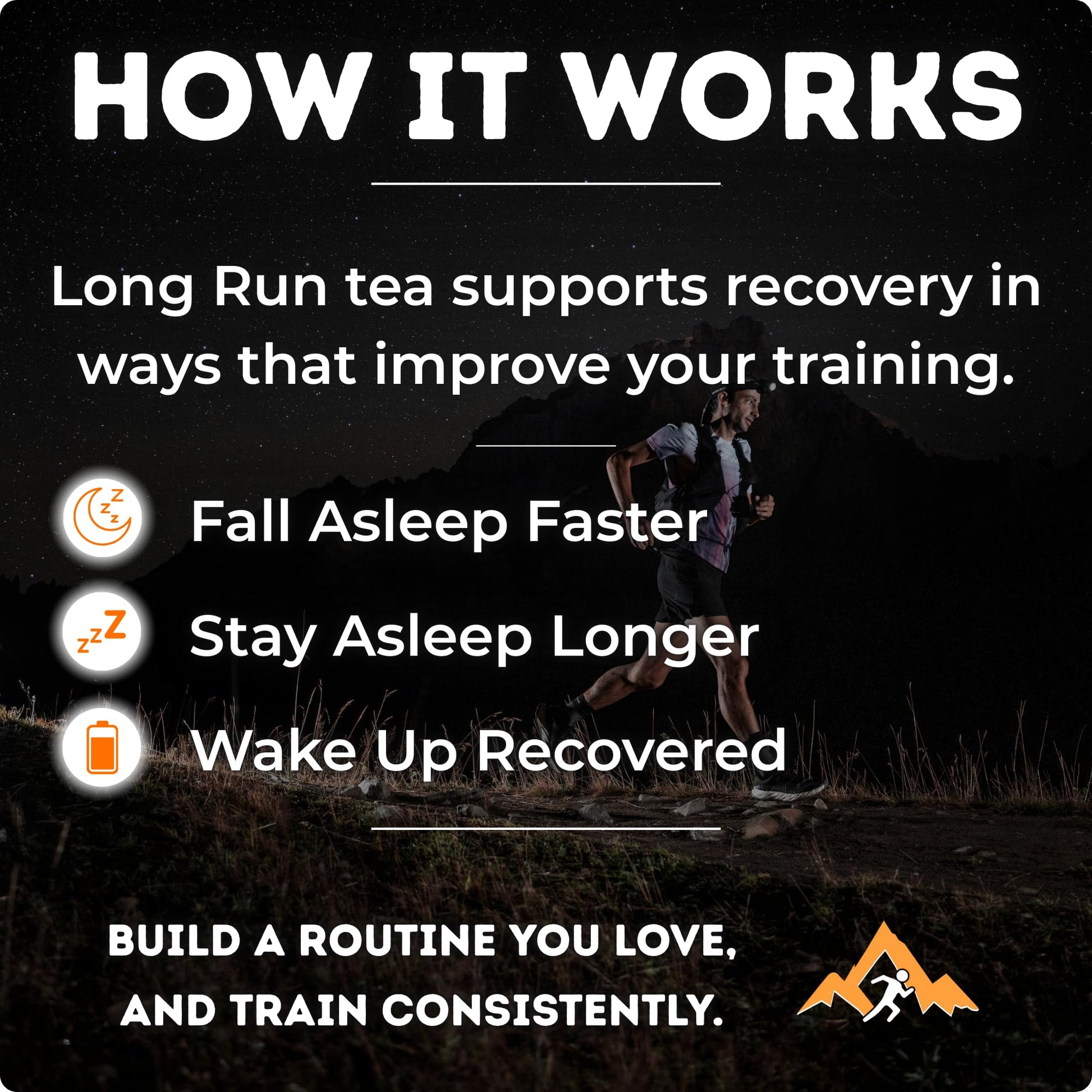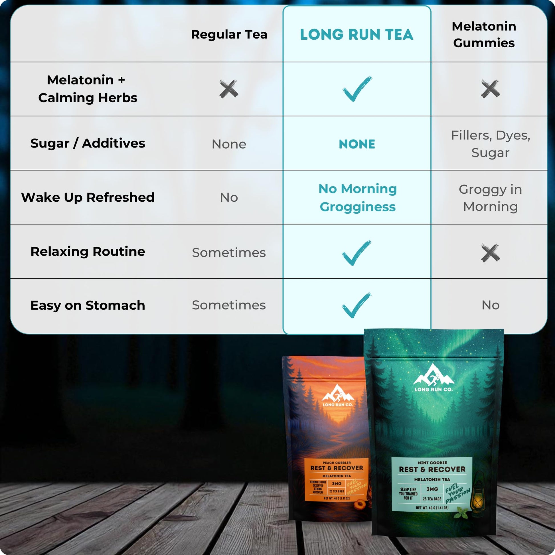 Details: Long Run Co.'s Rest & Recover Sleep Tea is a melatonin-powered tea designed to help you fall asleep fast, stay asleep longer, wake up refreshed, and recover like it matters. With 3mg or 6mg of melatonin per tea bag and light, dessert-inspired flavor options, it’s made for athletes who want sleep to feel like part of the training—not a luxury. It delivers recovery you can feel without pills, sugar, or fake wellness fluff. Rest & Recover Sleep Tea is all natural, caffeine-free and each pouch comes with 25 biodegradable tea bags ready to steep. Whether you’re winding down after a late workout, busy day at the office, or just getting ahead of tomorrow’s miles, this melatonin tea is your sleep and recovery tool to stay consistent and ready to take on tomorrow.
