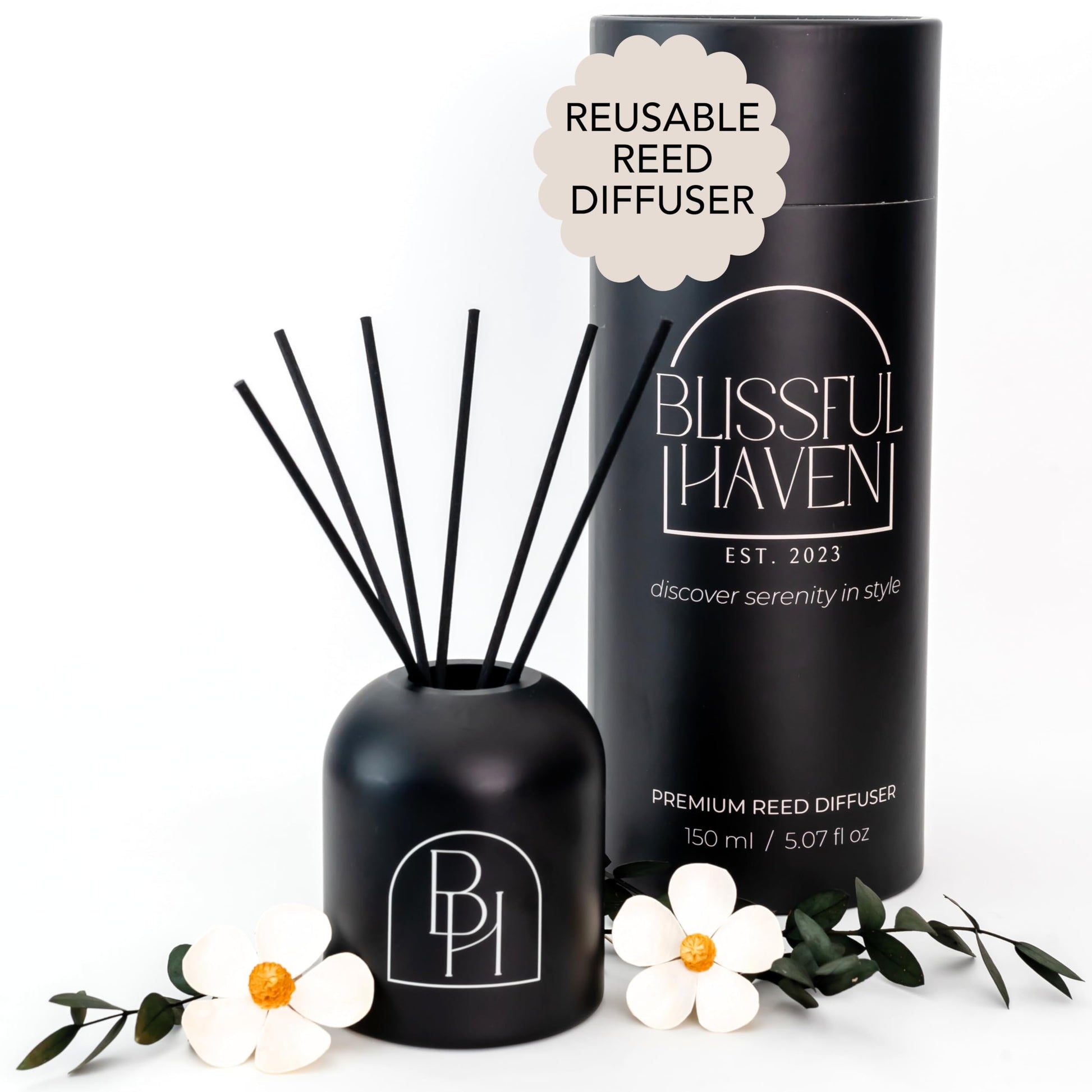 - ✨ Long Lasting, Premium Reed Diffuser Set: Includes (1) a luxurious, sticker-free, matte black glass vase, (2) 6 rattan oil diffuser sticks, (3) 4 high-quality dried flowers, and (4) a premium clean cotton essential oil (5.07oz), good for up to 60-75 days of continuous scent. Perfect for new home gift!