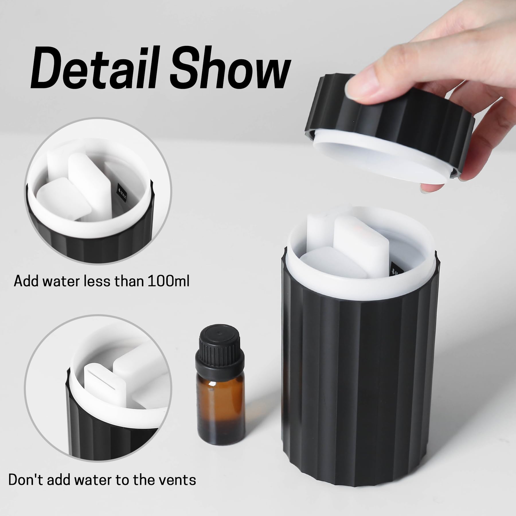- Type-C USB Car diffuser - This car diffuser humidifier compact 5.43*2.99 inch and cylindrical design fits perfectly into most car cup holders. With a capacity of 100ml and a spray volume of 15-20ml/h, you can inject essential oils into the water to add fragrance to the air, or just add water to create a cool fog that acts as an in-car air diffuser to keep you happy and feel fresher air.