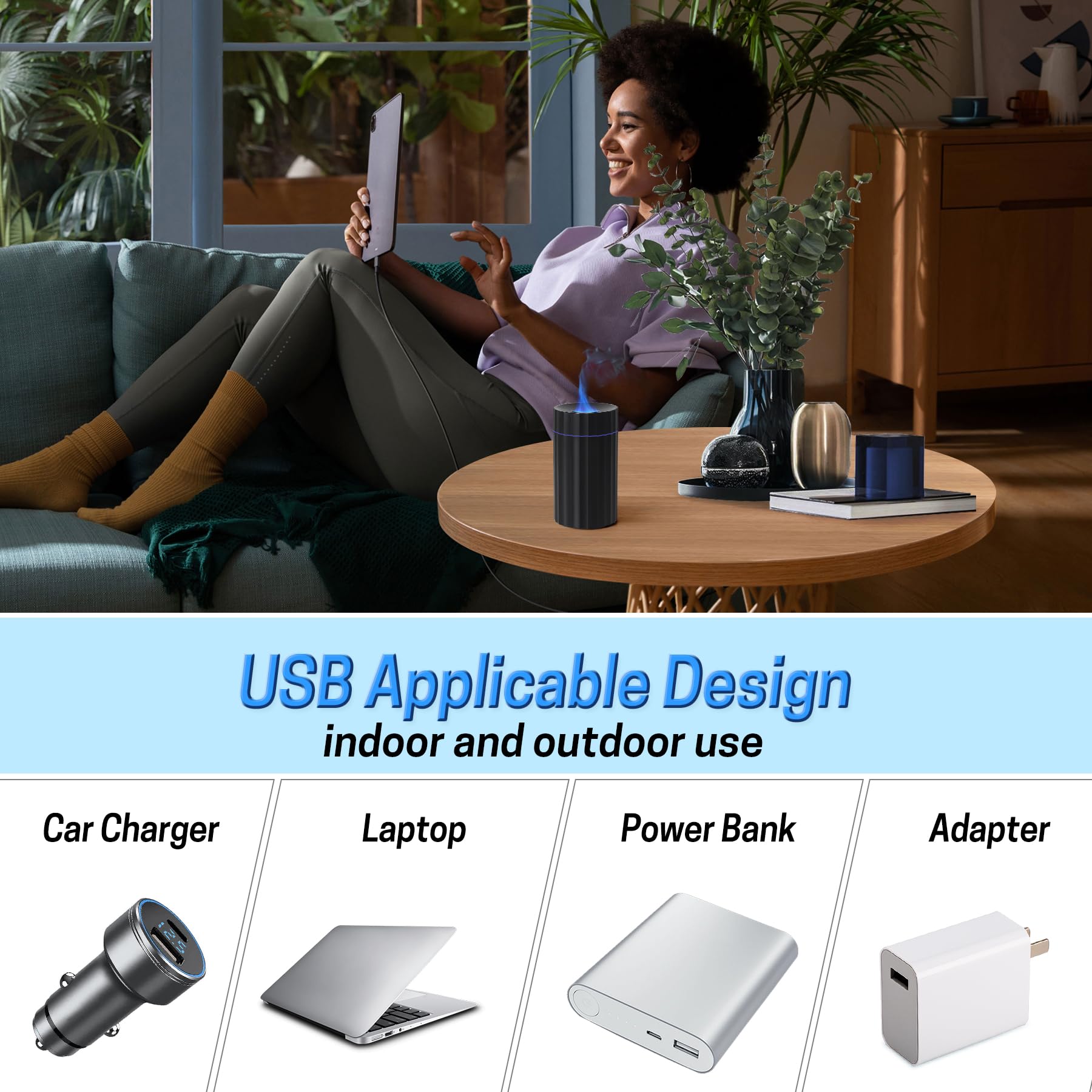 - Portable Safe Mini Travel diffuser - This small essential oil car diffuser is easy to carry when you're out on a picnic or on a weekend/holiday trip with your family, taking up a fraction of the space in your suitcase, and you can easily add cool mist and fragrance to your hotel with it. A portable travel essential oil diffuser. When camping, plug the portable car air diffuser into your power/laptop via USB cable and enjoy the relaxing moment.