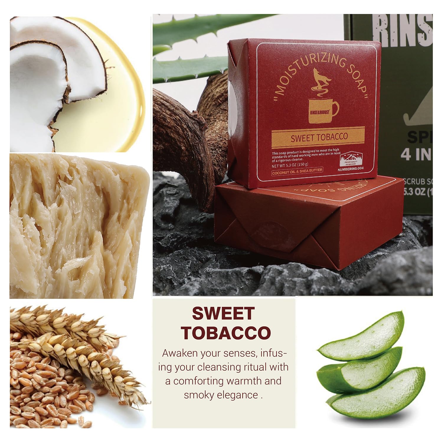 Rinse & Robust Mens Bar Soap Cleansing Bar Moisturizing & Exfoliating Scrub Soap Gift Set for Men | 4 in 1 Face Body Hand Beard Wash | Cinnamon, Lemon Cedar, Mint Ice Chips, Tobacco | 5.3 oz of 4 Bars