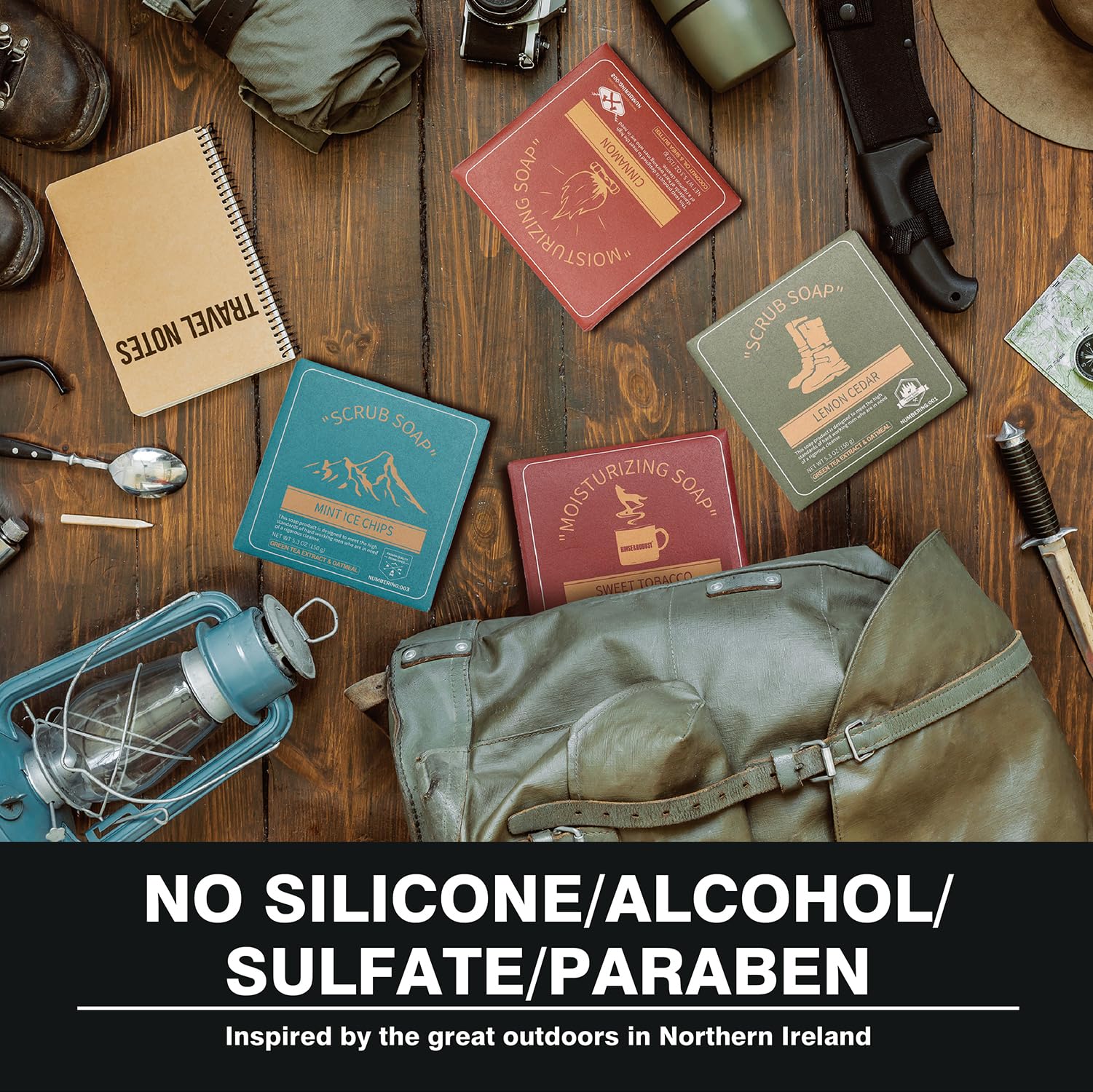- SPECIAL CRAFTED: The soap wrappers tell stories of The Jungle, Bonfire, Snow Mountain, and Sunrise Coffee & Cigarettes, whisking you away to rugged escapes and scenery along the way with every wash. Compactly sized for stowing in your pack or gym bag