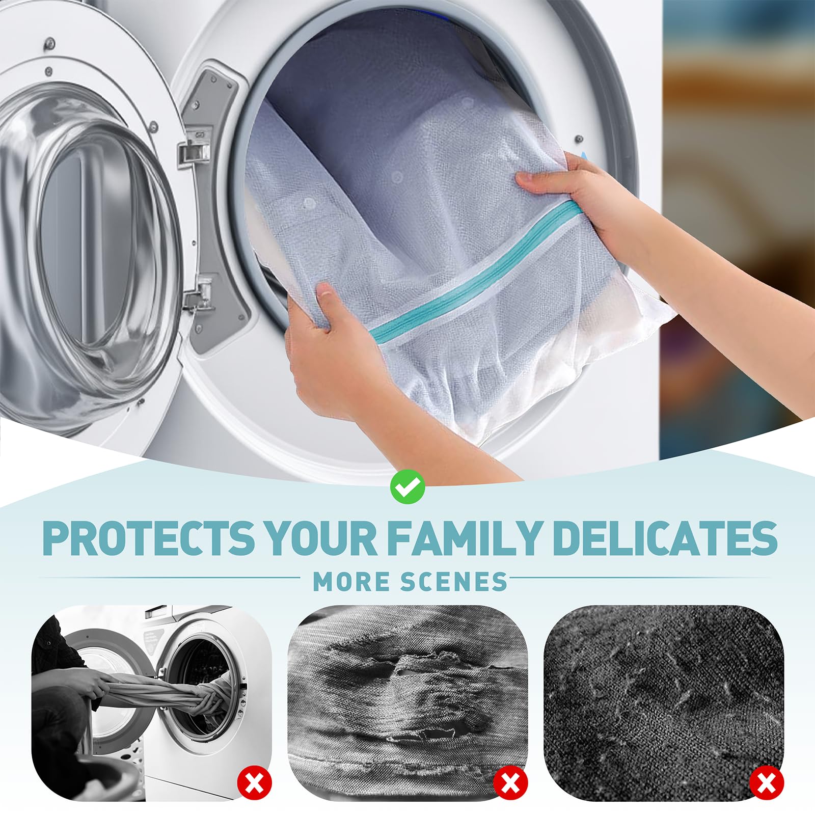 - STOP SHRINKING & SNAGGING : Our fine mesh laundry bags create a protective barrier in the washer, shielding bras, lingerie, silk, and specialty fabrics from harsh agitation and snags. The 0.5mm micro-holes prevent hooks from damaging other clothes and keep socks from getting lost—so your delicate items last longer.