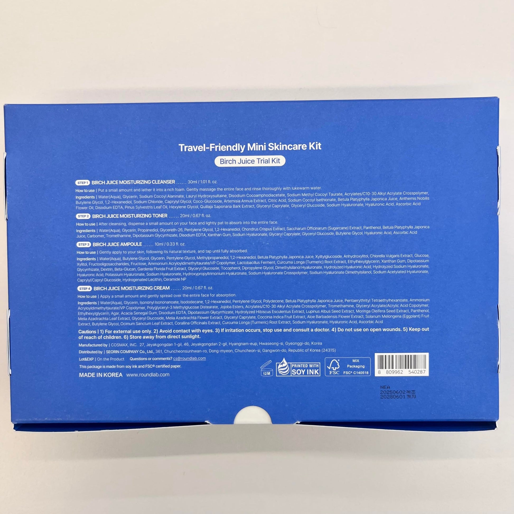 - [ALL-IN-ONE BESTSELLER KIT] Experience ROUND LAB’s most loved Birch Juice Moisturizing line in one essential mini Kit. Includes Cleanser 30ml, Toner 20ml, Serum 10ml, Cream 20ml for a hydration 4-step routine