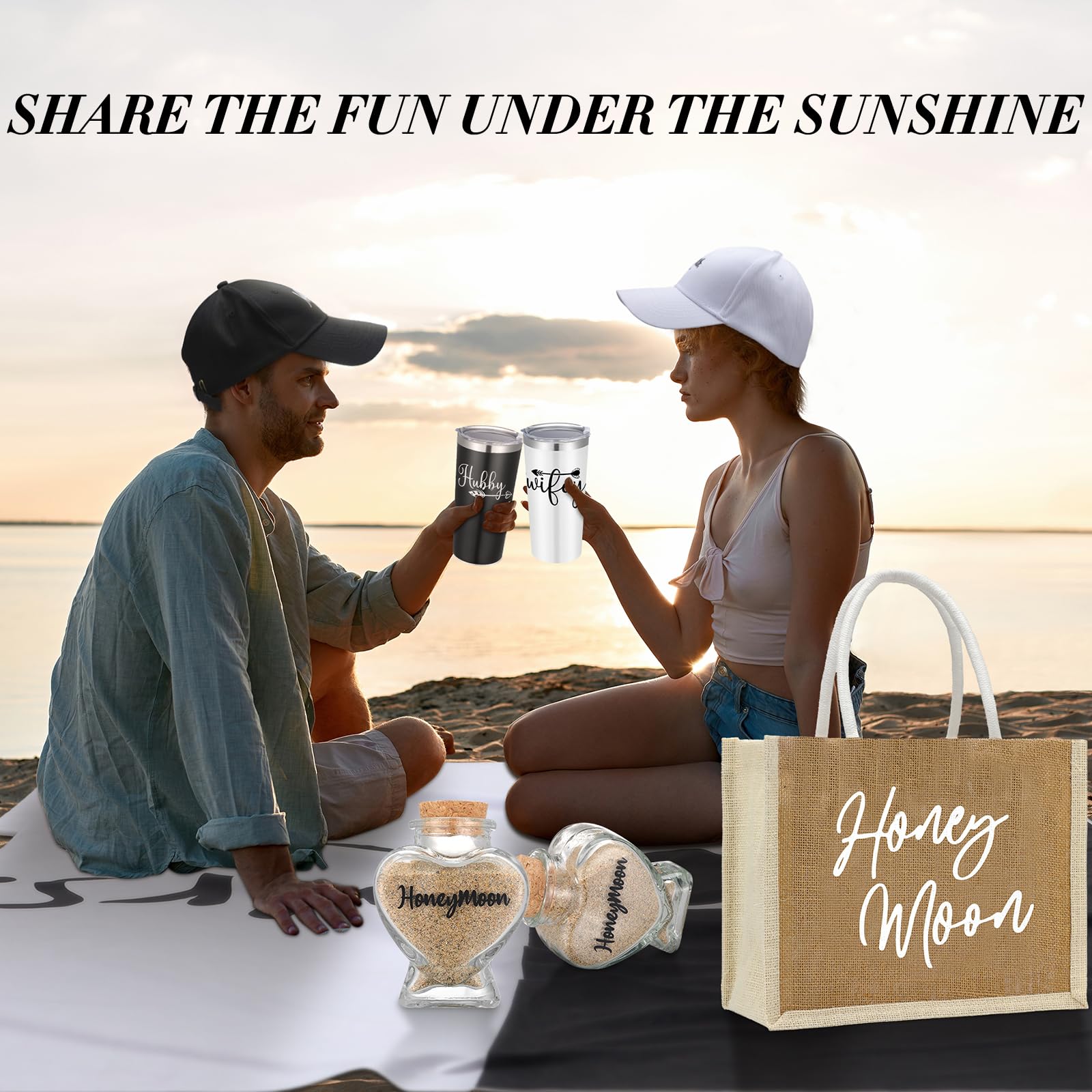 - Wedding Gift Set: the package comes with 14 pieces of newlywed gifts for couples, including 1 wedding towel of about 78 x 58 inches in length and width, 2 wine tumblers, 2 hats, 2 passport holders, 2 baggage tags, 2 sleep masks, 2 glass drift bottles, and 1 honeymoon tote bag, nice set for your wedding gifting needs