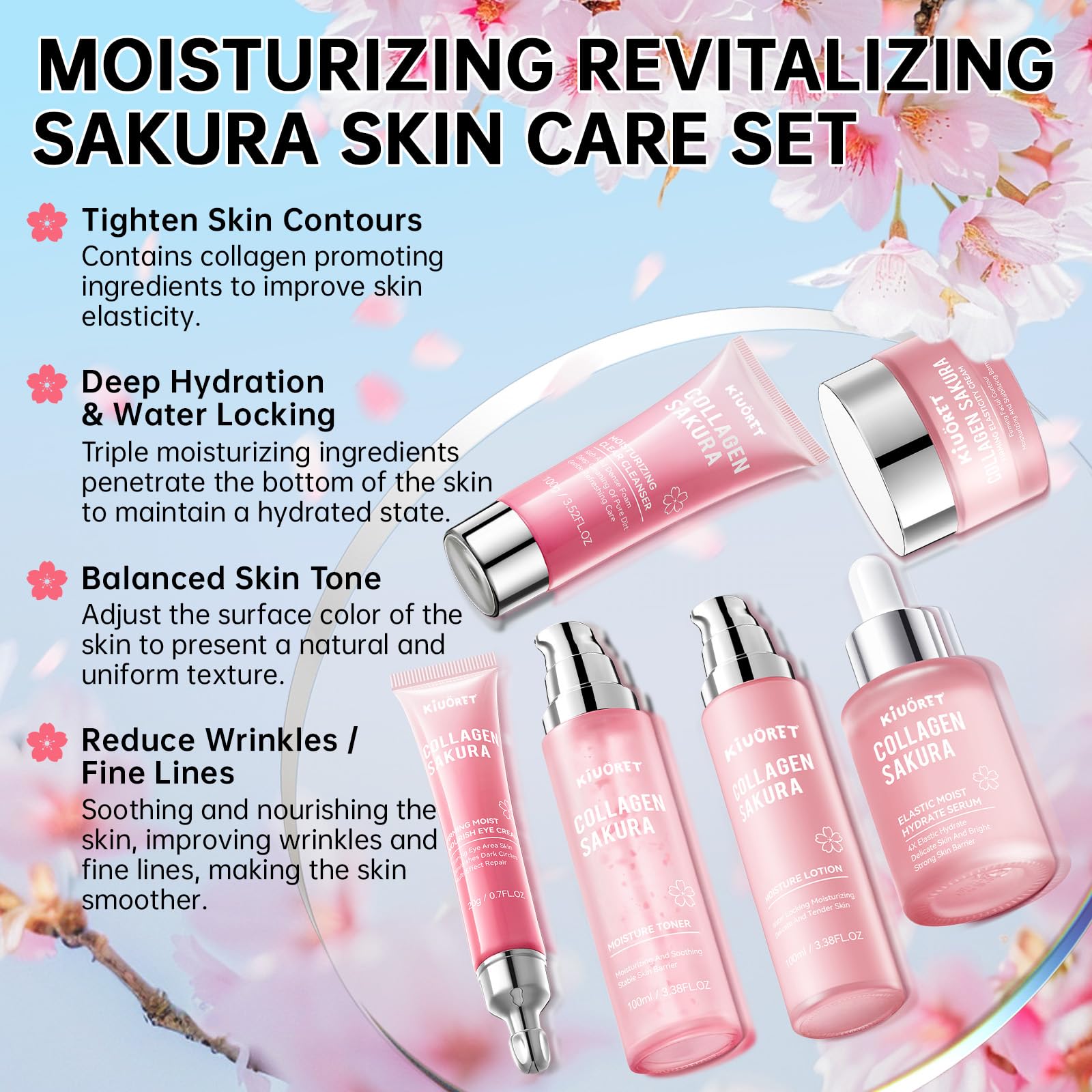 Sakura Skin Care Set - 6 PCS Cherry Blossom Skin Care Kit with Cleanser, Toner, Serum, Lotion, Eye Cream & Face Cream - Moisturizes Skin & Boosts Collagen - Korean Skin Care Set for Teen Girls & Women